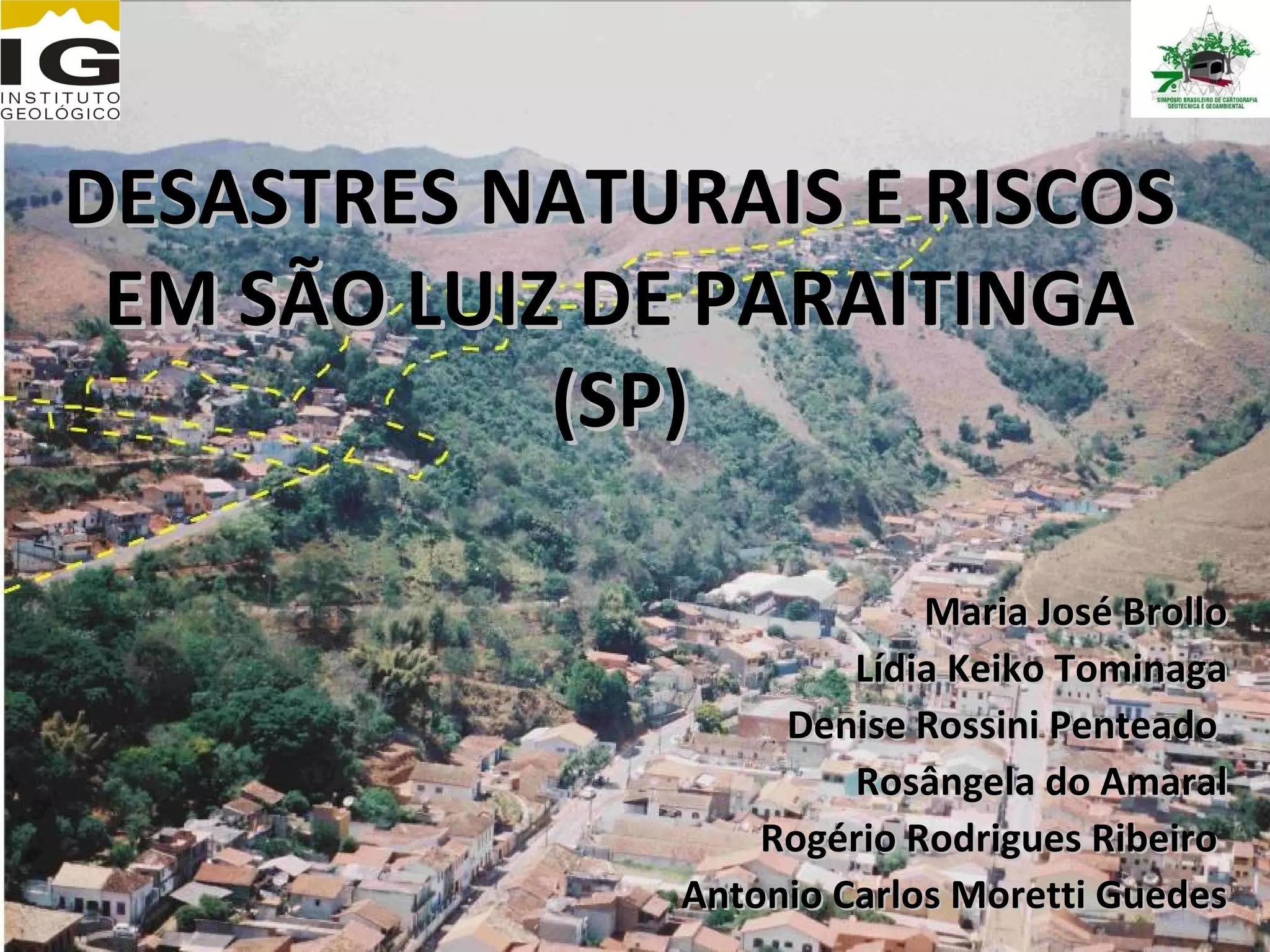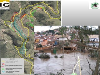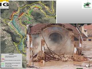 O documento analisa o desastre natural ocorrido em São Luiz de Paraitinga (SP) no verão de 2009-2010, considerando as variáveis da equação de risco (R=PxVxD). O desastre causou grandes danos devido às chuvas extremas terem excedido a marca histórica, enquanto a suscetibilidade, potencial de indução, vulnerabilidade e dano potencial eram altos a muito altos, levando a um risco de proporções muito elevadas para a cidade.