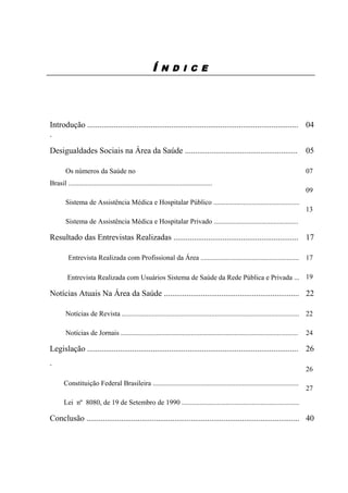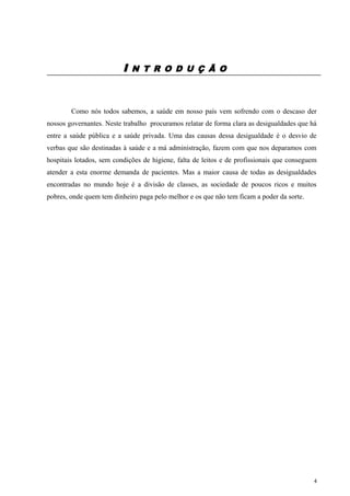 O documento discute as desigualdades no sistema de saúde brasileiro entre a rede pública e privada. A rede pública sofre com falta de recursos e leitos, enquanto a rede privada oferece melhores condições e atendimento mais rápido. Isso evidencia a desigualdade social no acesso à saúde no Brasil.