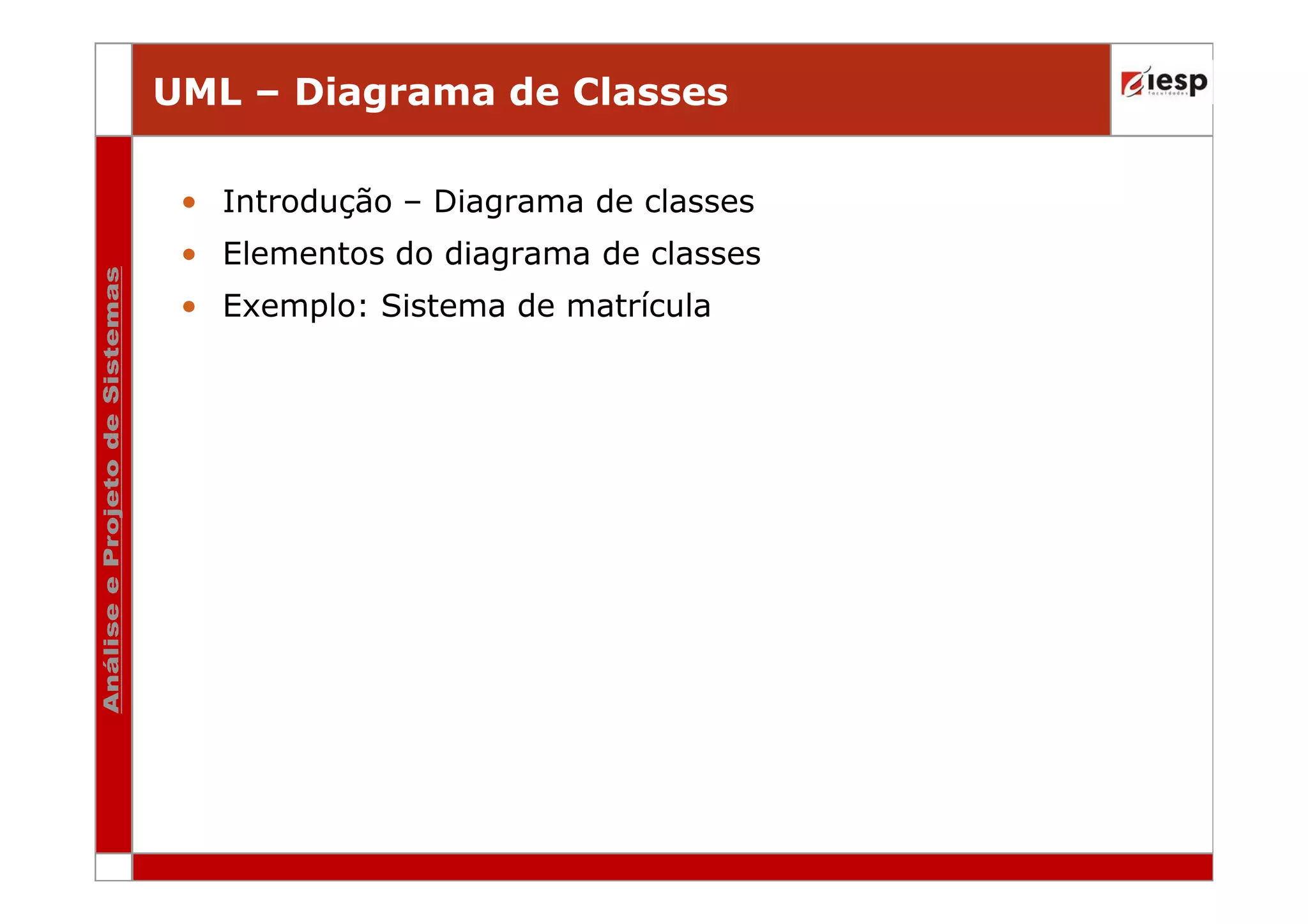O documento descreve um diagrama de classes para um sistema de matrícula universitária. O diagrama inclui classes como Estudante, Disciplina, Turma e suas relações. Ele ilustra os atributos e métodos dessas classes, bem como os relacionamentos entre elas como associação, agregação e generalização.