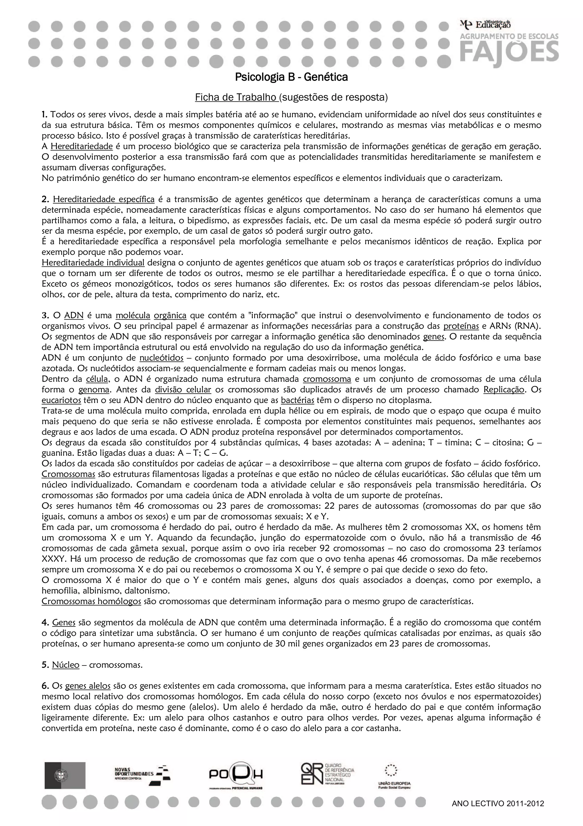 O documento discute os conceitos de hereditariedade específica e individual, ADN, cromossomos e genes. Explica que a hereditariedade envolve a transmissão de informação genética entre gerações e determina características comuns a uma espécie e únicas a cada indivíduo. O ADN armazena essa informação nos cromossomos e genes, que influenciam o fenótipo de acordo com o ambiente.