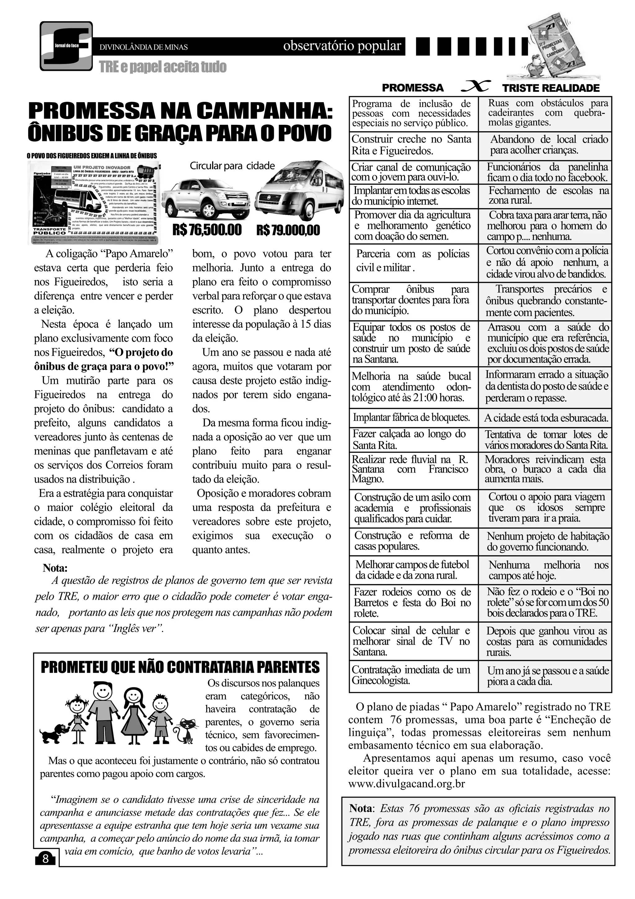 O documento descreve várias promessas feitas por um candidato durante sua campanha eleitoral para melhorar serviços públicos e a vida dos cidadãos. Após um ano de governo, quase nada foi cumprido e a situação piorou em muitas áreas como saúde, educação e infraestrutura. Moradores e oposição cobram explicações sobre as promessas não cumpridas, especialmente sobre um projeto de ônibus gratuito para determinada região.