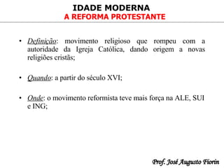 O documento descreve o surgimento do protestantismo na Europa no século XVI, mencionando os principais movimentos como o luteranismo na Alemanha, o calvinismo na Suíça e o anglicanismo na Inglaterra, assim como a contra-reforma católica. Fatores como a corrupção do clero católico e o fortalecimento dos Estados nacionais contribuíram para o surgimento do protestantismo, enquanto a Igreja Católica respondeu com medidas como o Concílio de Trento e a Inquisição.