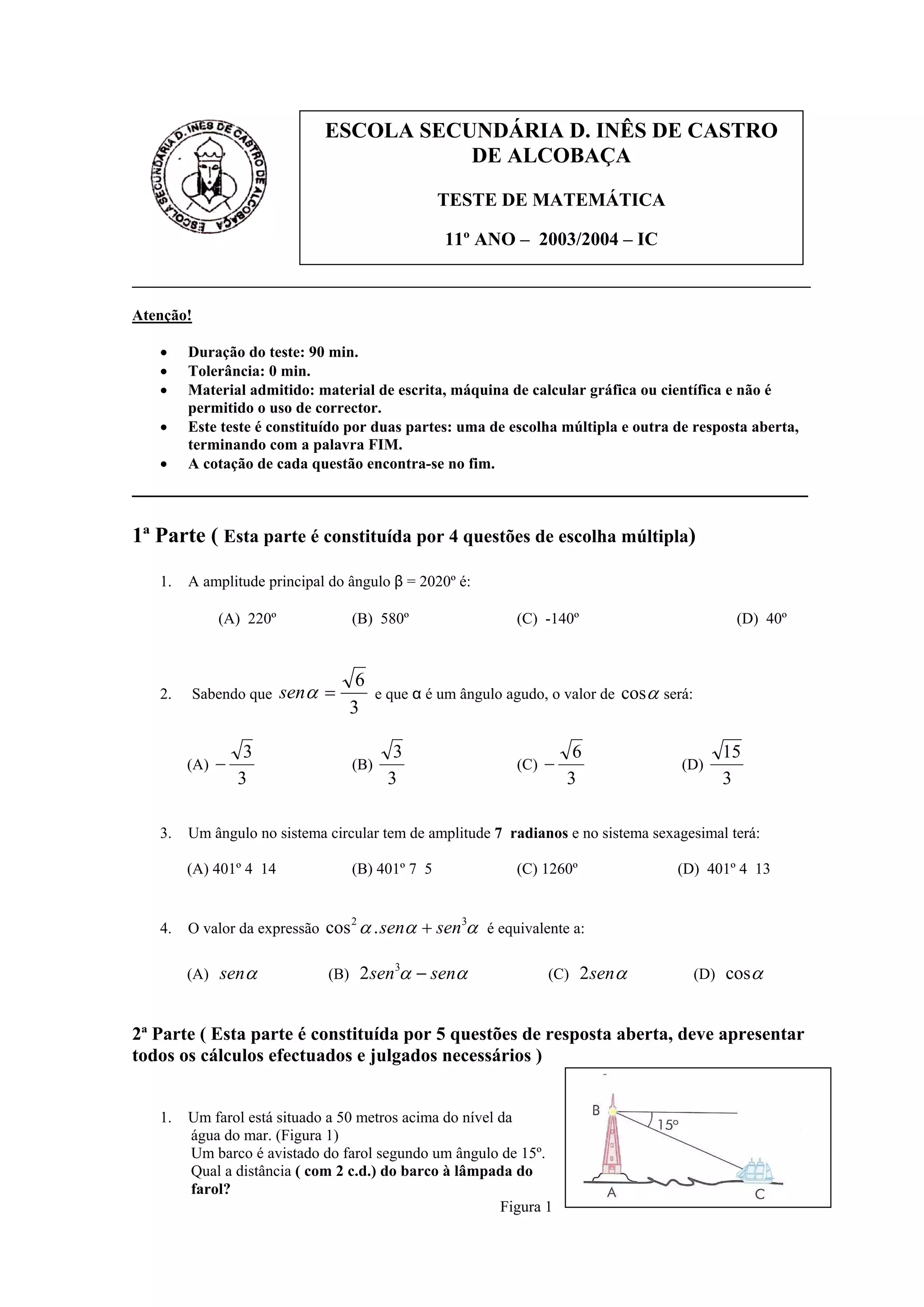Este documento é um teste de matemática do 11o ano com questões de escolha múltipla e resposta aberta sobre ângulos, trigonometria, estatística e correlação. O teste é constituído por duas partes e tem uma duração de 90 minutos, com tolerância zero.