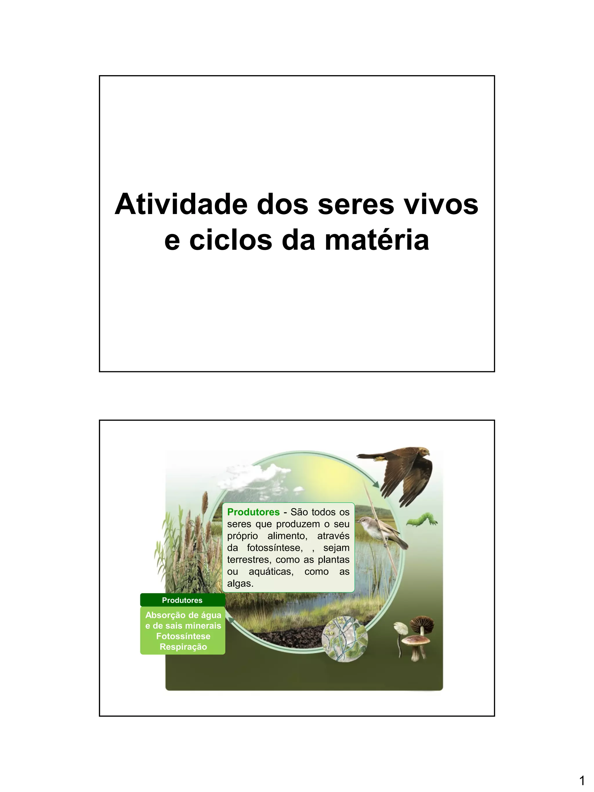 O documento descreve os principais ciclos biogeoquímicos - carbono, oxigênio, água e azoto. Explica que esses ciclos envolvem a transferência desses elementos entre a biosfera, atmosfera, hidrosfera e litosfera, mediada por seres vivos e processos naturais como fotossíntese, respiração e decomposição.