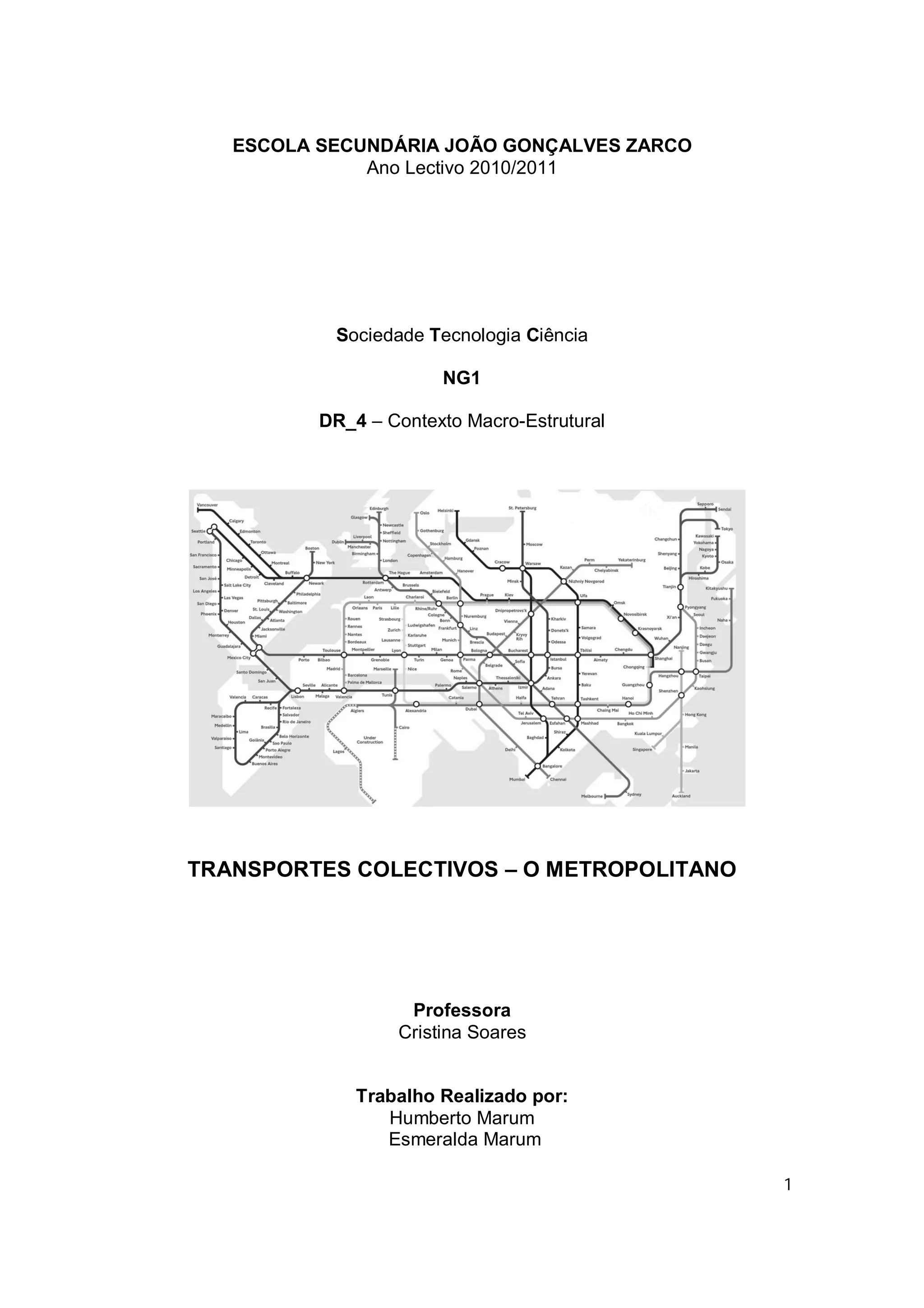 Este documento resume um trabalho de pesquisa sobre o desenvolvimento e evolução do metrô. Ele começa explicando como o metrô surgiu em Londres no século 19 para resolver problemas de trânsito. Depois discute como o metrô se tornou um meio de transporte essencial em muitas cidades e como as estações refletem o desenvolvimento cultural e tecnológico das sociedades. Por fim, resume a história do metrô em Portugal e fornece algumas curiosidades sobre os sistemas de metrô ao redor do mundo.