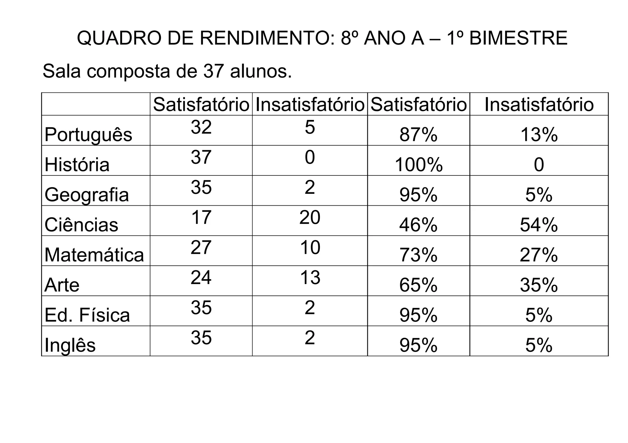 O documento apresenta o quadro de rendimento do 8o ano A no 1o bimestre, mostrando que a maioria dos alunos teve desempenho satisfatório em Português, História, Geografia, Ed. Física e Inglês, enquanto Ciências teve o maior percentual de alunos com desempenho insatisfatório. Matemática e Arte tiveram aproximadamente um quarto dos alunos com rendimento insatisfatório.