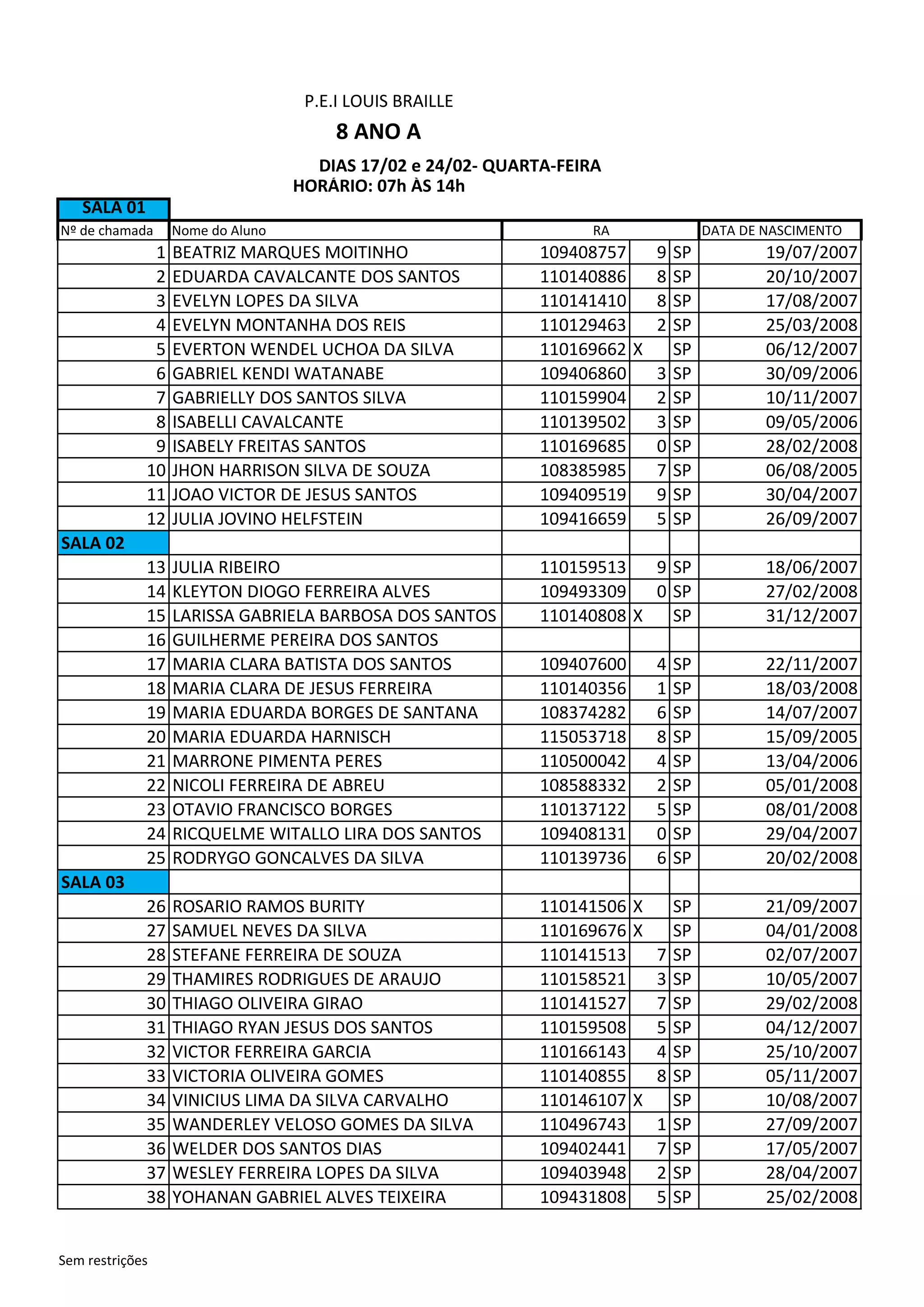 O documento lista 38 alunos matriculados em três salas de aula de uma escola. Para cada aluno é fornecido o número de chamada, nome, data de nascimento e outras informações como série, turno e dias de aula.