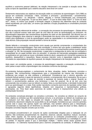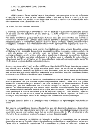 O livro analisa como ensinar com base em duas concepções pedagógicas: a tradicional e a construtivista. A concepção tradicional vê o professor como transmissor de conhecimento e o aluno como receptor passivo. Já a concepção construtivista defende que o aluno constrói ativamente o conhecimento com a mediação do professor. O livro propõe analisar variáveis como sequências didáticas, papéis do professor e aluno, e tipos de conteúdos para melhorar a prática educativa.