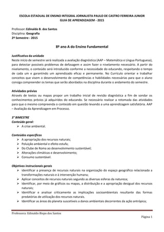 Este documento apresenta o plano de ensino de Geografia para alunos do 8o ano do Ensino Fundamental. Nele são descritos os objetivos, conteúdos e atividades a serem desenvolvidos no 3o e 4o bimestres. No 3o bimestre serão estudados temas relacionados à crise ambiental global, como apropriação de recursos, poluição e desenvolvimento sustentável. No 4o bimestre, a unidade tratará da Geografia comparada da América, abordando aspectos históricos e culturais de
