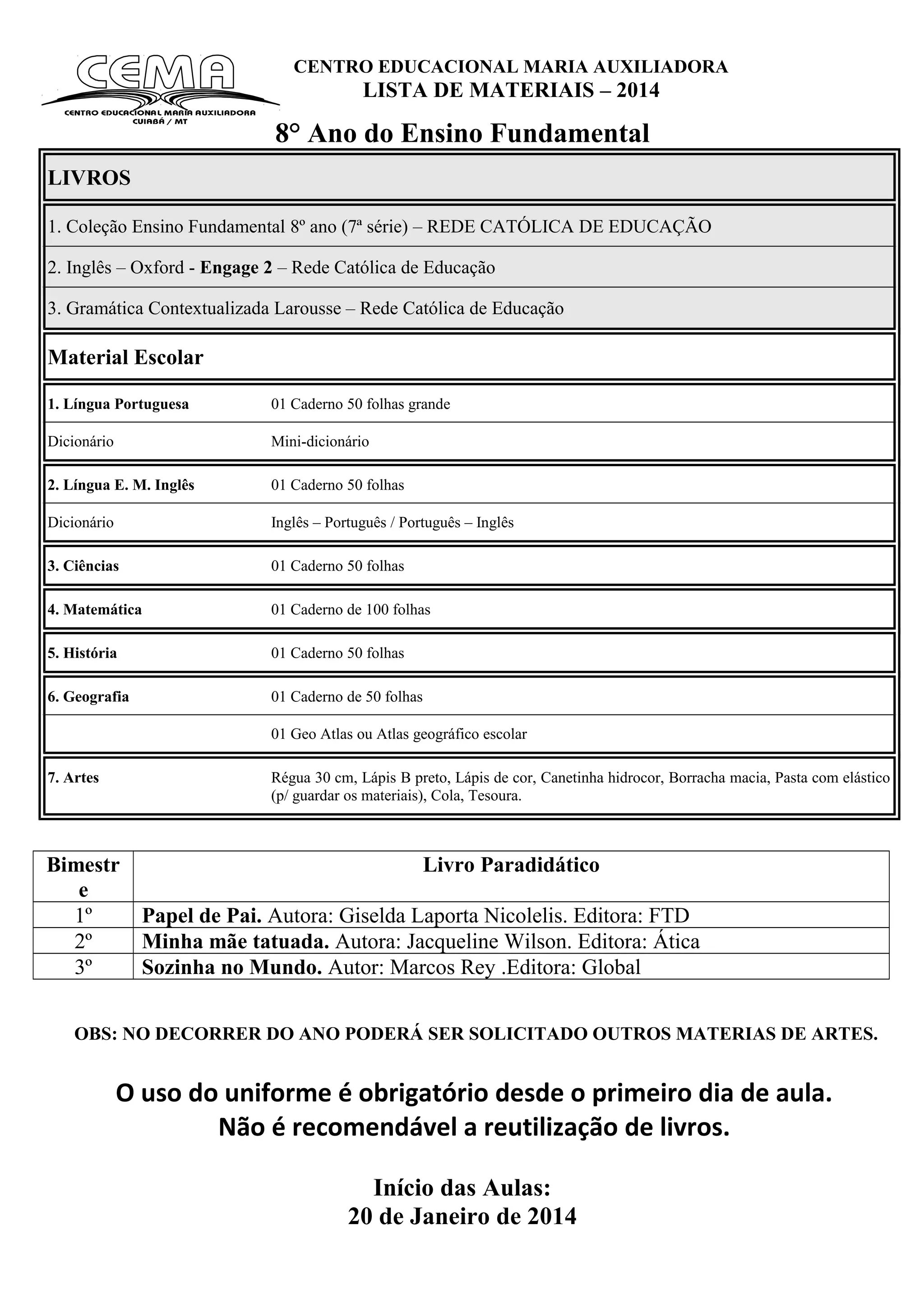 A lista de materiais escolares para o 8o ano do Ensino Fundamental no Centro Educacional Maria Auxiliadora inclui livros didáticos, cadernos e outros itens de material escolar necessários para as disciplinas de Português, Inglês, Ciências, Matemática, História, Geografia e Artes. Além disso, são listados os livros paradidáticos a serem utilizados nos três bimestres letivos.