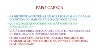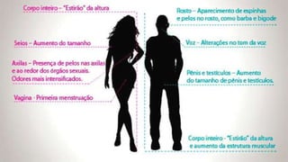 O documento discute as mudanças físicas e emocionais que ocorrem durante a puberdade e adolescência. Ele explica que a puberdade é parte da adolescência e envolve transformações no corpo, como crescimento dos pelos e órgãos genitais, em meninos entre 9-13 anos e meninas entre 8-13 anos. Também aborda sinais de puberdade precoce ou atrasada que requerem avaliação médica.