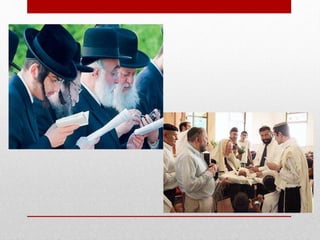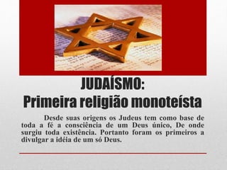 O documento aborda as principais características do judaísmo, hinduísmo e budismo, destacando suas crenças centrais, práticas, e figuras significativas. O judaísmo é uma religião monoteísta que enfatiza a importância da ética e da alimentação kosher, enquanto o hinduísmo é politeísta e acredita na reencarnação e no carma. O budismo, fundado por Sidarta Gautama, promove o 'caminho do meio' e busca a eliminação do sofrimento através da compreensão de suas quatro nobres verdades.