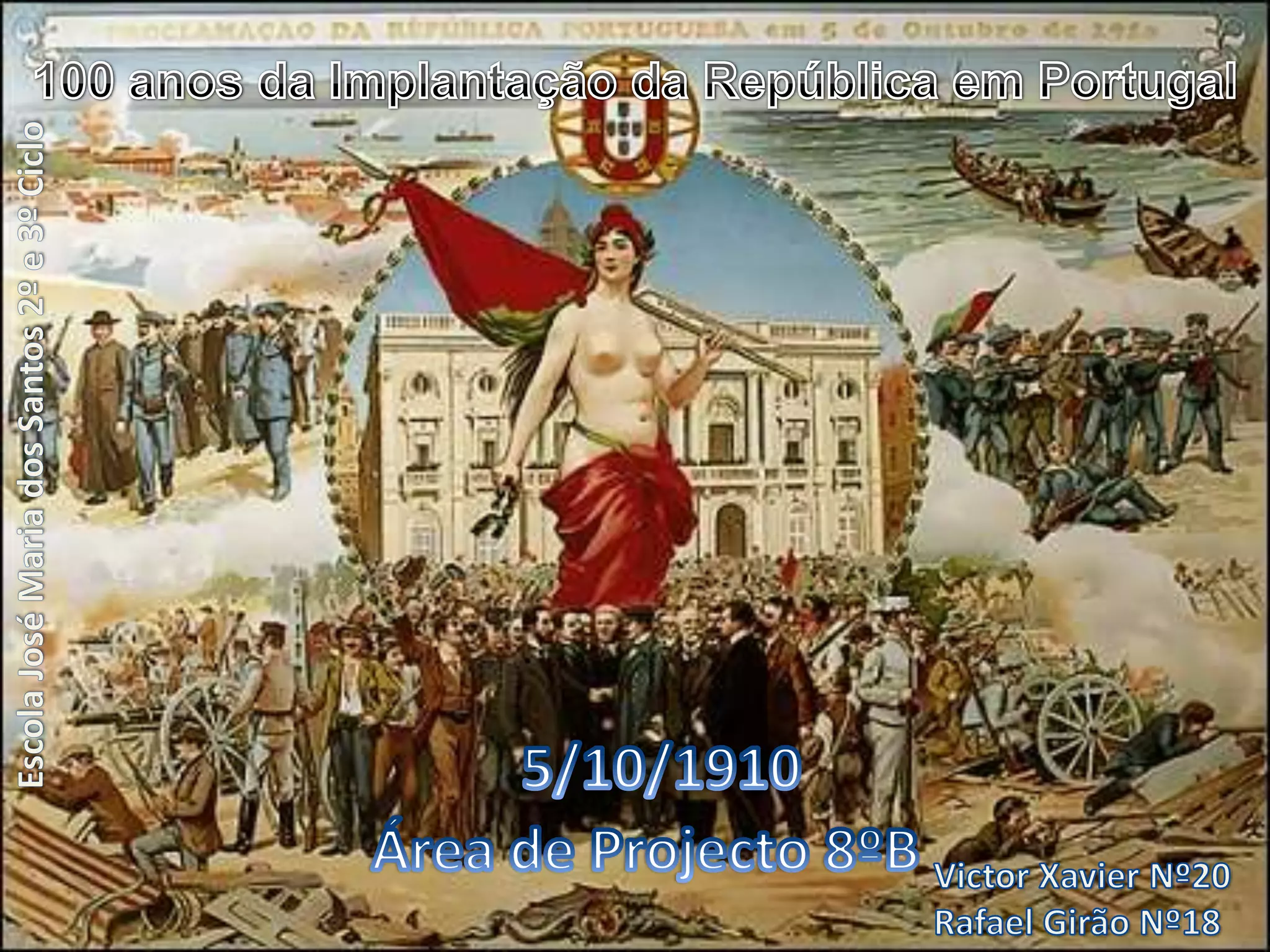 O documento descreve a implantação da República Portuguesa em 5 de outubro de 1910, que resultou de um golpe de estado organizado pelo Partido Republicano Português para destituir a monarquia constitucional. Detalha os eventos que levaram ao golpe, incluindo reuniões de planejamento e quartéis que se juntaram à revolução. Também lista as causas da queda da monarquia, como a subjugação aos interesses britânicos e os gastos da família real.