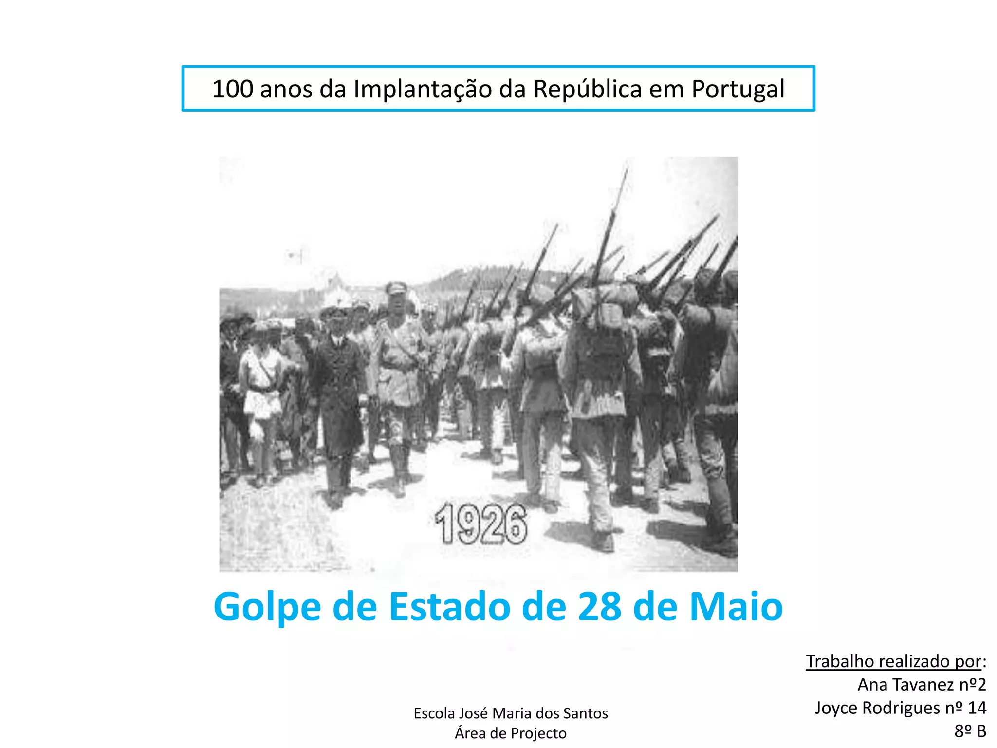 O Golpe de Estado de 28 de Maio de 1926 pôs fim à Primeira República Portuguesa e deu início ao Estado Novo. O golpe começou em Braga, onde Cunha Leal e Gomes da Costa organizaram apoiantes. Em 28 de Maio, iniciou-se a revolta militar em Portugal. Nos dias seguintes, as forças militares golpistas assumiram o controle do país sem resistência significativa.