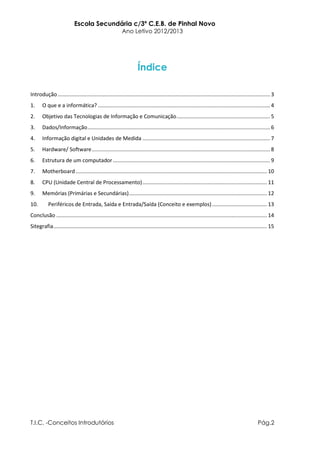 O documento apresenta conceitos introdutórios sobre tecnologias de informação e comunicação (TIC). Explica o que é informática, a estrutura básica de um computador, componentes como processador, memória e periféricos, além de definir termos como hardware, software, dados e informação digital. O texto é dividido em seções curtas com o objetivo de apresentar os principais conceitos de forma resumida e acessível.