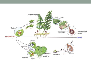 O documento descreve os ciclos de vida de três organismos: (1) Espirogira, uma alga com ciclo de vida haplonte; (2) Polipódio, uma planta com ciclo de vida haplodiplonte; (3) Gato, um mamífero com ciclo de vida diplonte. Resume as principais características de cada ciclo, como a ocorrência de meiose, presença de estruturas multicelulares haplontes e diplontes, e alternância ou não de gerações.