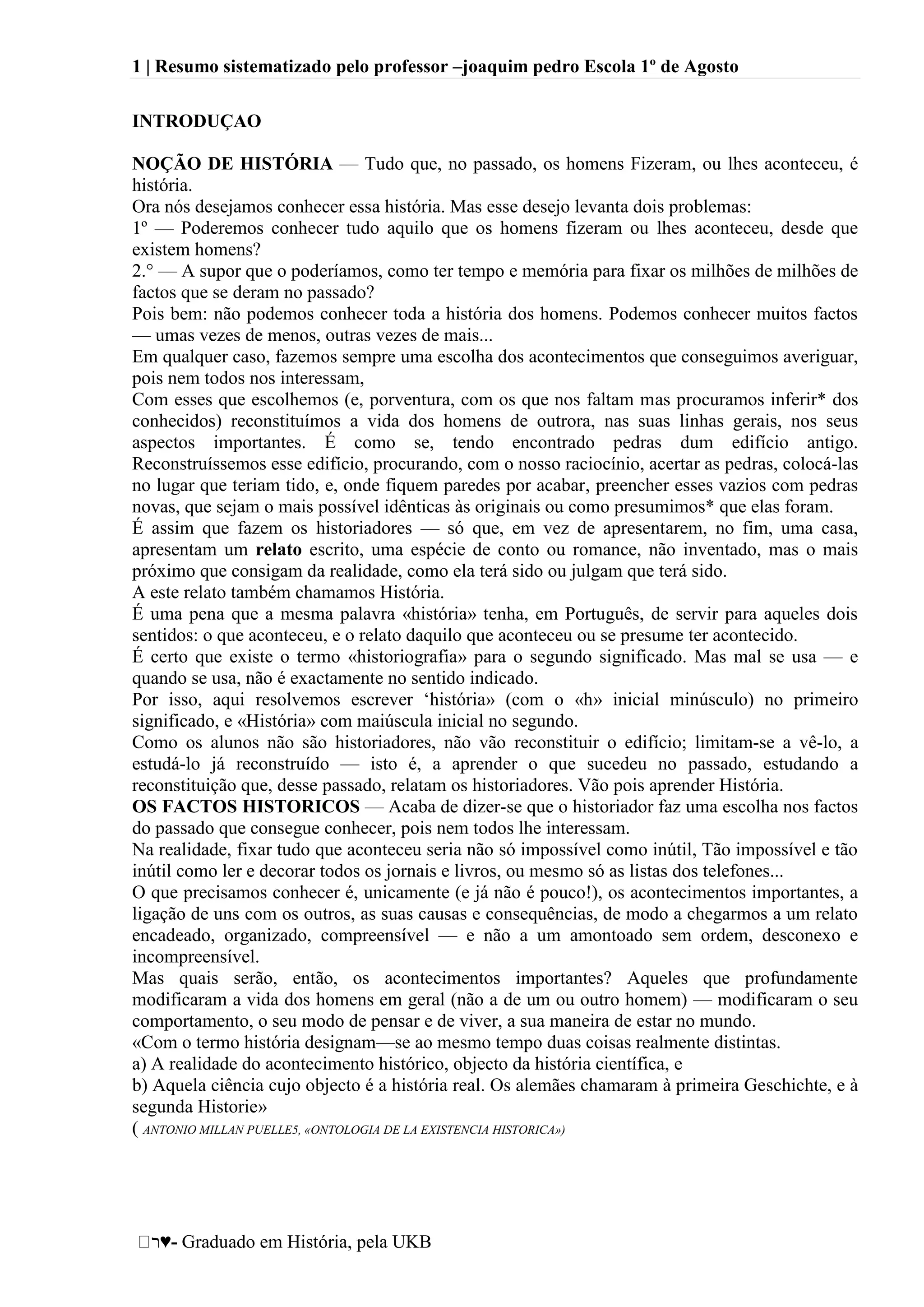 Este documento discute a noção de história e como os historiadores estudam e interpretam os eventos do passado. Explica que os historiadores selecionam quais fatos estudar e tentam reconstruir o passado usando esses fatos junto com inferências lógicas. Também discute os principais fatores que influenciam a história, como a geografia, economia, sociedade e ideias.