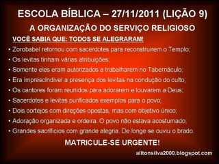 O documento discute como o povo de Jerusalém seguiu o exemplo de seus líderes Neemias e Esdras após um período de avivamento espiritual, reconstruindo os muros da cidade, separando-se de esposas estrangeiras e estabelecendo o sábado como dia sagrado de adoração e descanso.