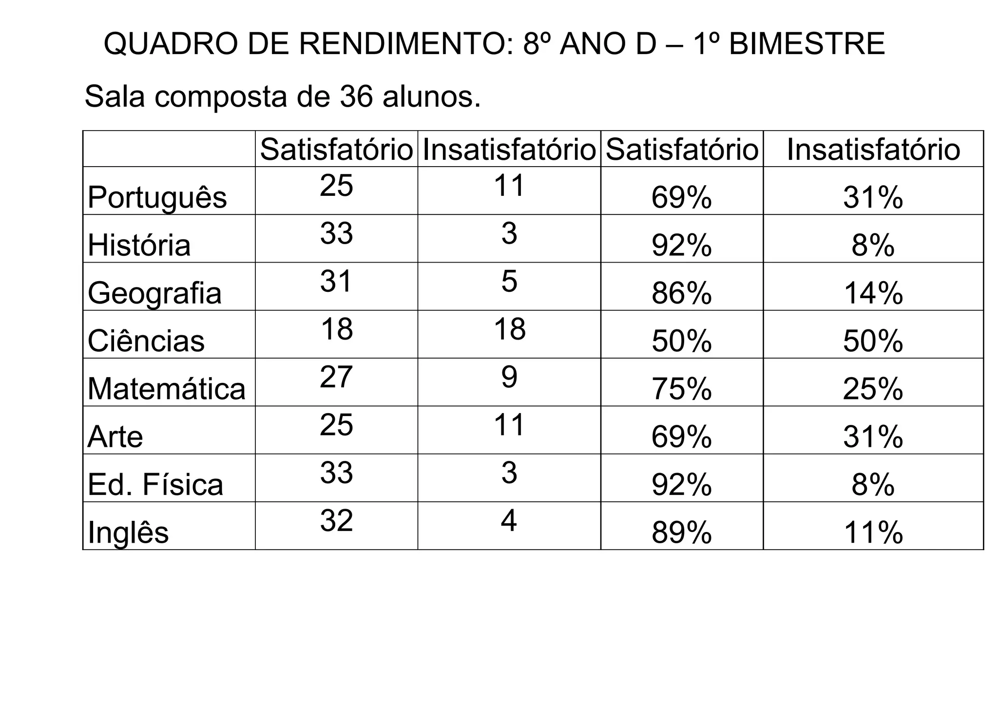 O documento apresenta o quadro de rendimento do 8o ano D no primeiro bimestre, mostrando que a maioria dos alunos teve desempenho satisfatório em História, Geografia, Matemática e Educação Física, enquanto metade teve desempenho insatisfatório em Ciências.