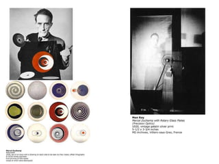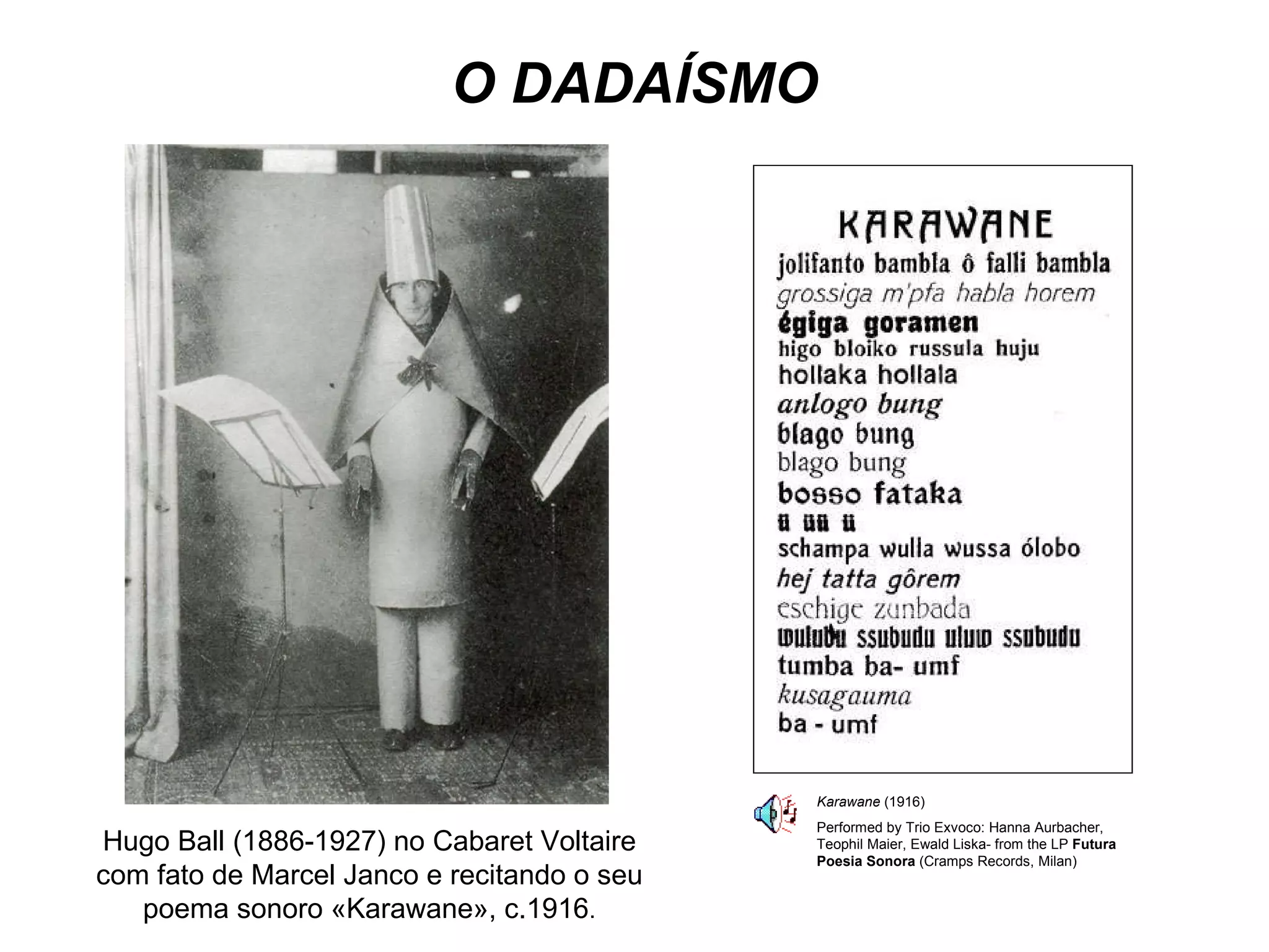 O documento descreve o movimento artístico Dadaísmo, incluindo seus principais artistas e obras. O Dadaísmo surgiu em Zurique durante a Primeira Guerra Mundial como uma reação ao conflito e aos ideais burgueses, promovendo o absurdo, o acaso e o nonsense. Artistas como Hans Arp, Marcel Duchamp, Hannah Höch e Kurt Schwitters criaram obras que questionavam as noções tradicionais de arte por meio de técnicas como colagem e ready-mades.