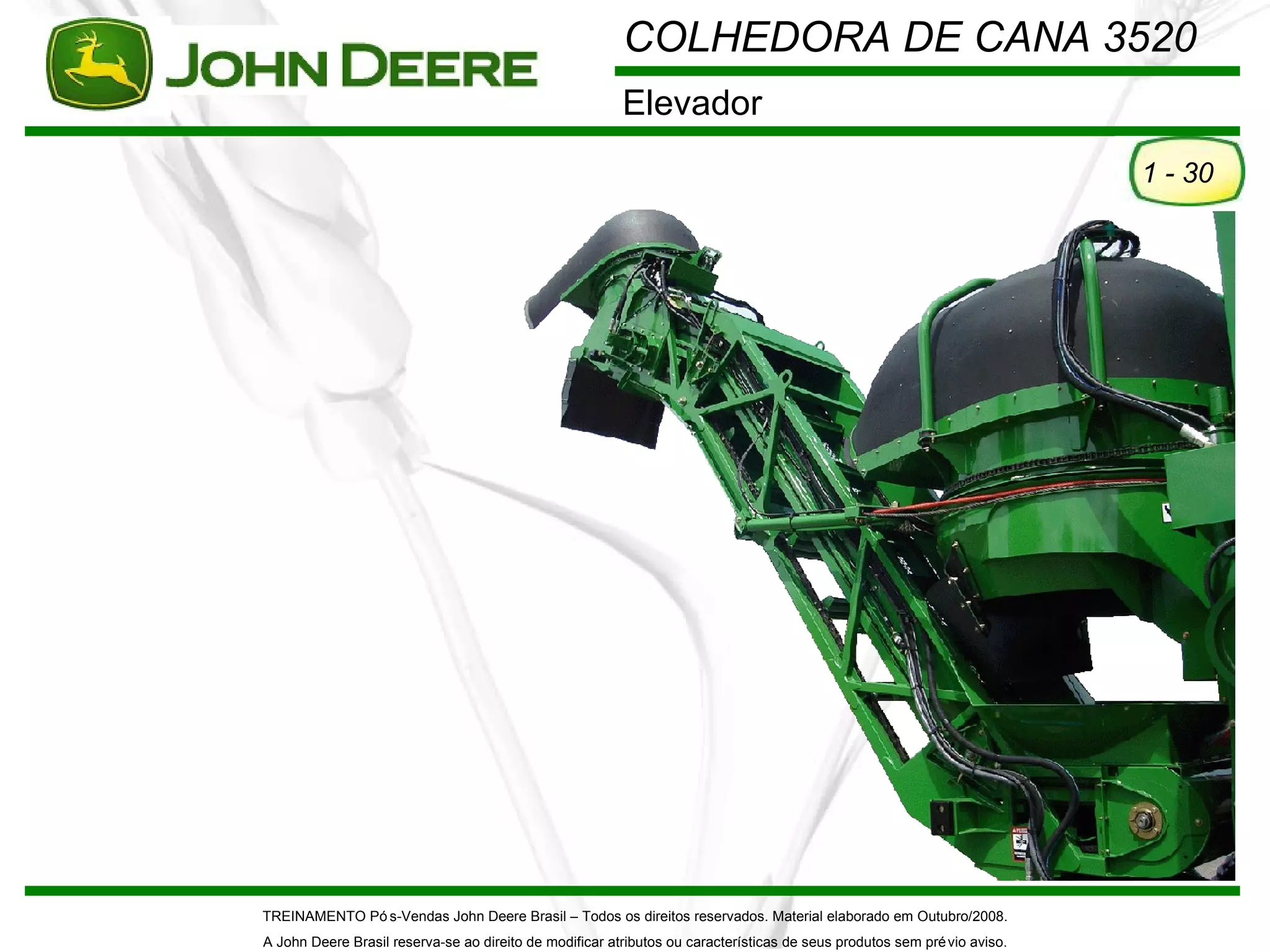 O documento descreve as características e especificações técnicas do elevador da colhedora de cana John Deere 3520, incluindo sua estrutura tubular, extensões opcionais, ajuste da folga da corrente, rodas dentadas intermediárias, rota das mangueiras, manutenção das correntes, motores hidráulicos diretamente montados, controles para levantar e abaixar, bomba hidráulica, válvulas de alívio, funções do elevador e especificações dos componentes.