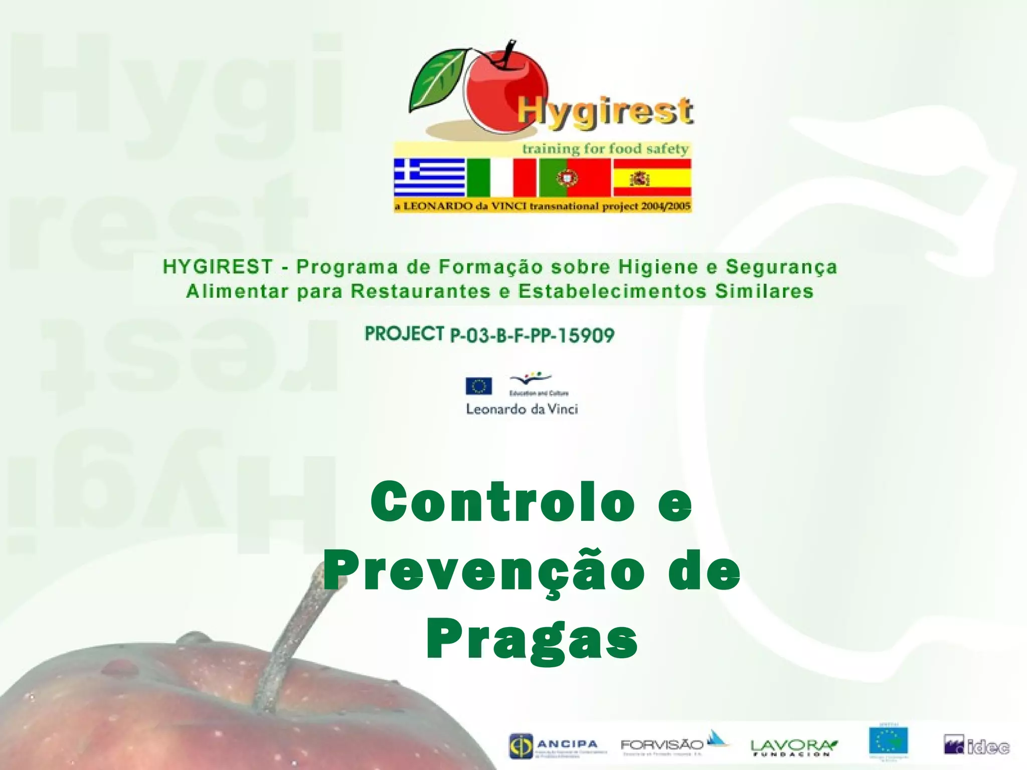 O documento discute o controle e prevenção de pragas em estabelecimentos alimentares. Detalha as principais pragas como roedores, moscas, baratas e formigas e suas características. Também descreve técnicas de controle químico e físico dessas pragas, enfatizando a importância da higiene e da remoção de fontes de alimentos para evitar infestações.