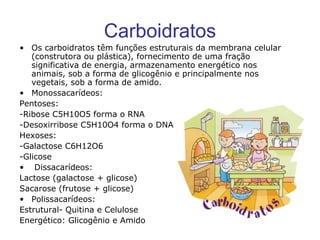 Este documento descreve os principais tipos de compostos orgânicos encontrados nos seres vivos, incluindo carboidratos, lipídeos, proteínas, enzimas e ácidos nucleicos. Carboidratos incluem monossacarídeos como glicose e ribose, dissacarídeos como sacarose e lactose, e polissacarídeos como amido e glicogênio. Lipídeos incluem glicerídeos, cerídios, carotenóides e esteróides. Proteínas e
