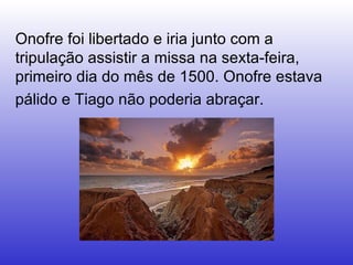 Onofre e a tripulação assistiram a primeira missa na terra recém-descoberta. Após a missa, houve uma festa com comida e vinho para comemorar. Durante a festa, Onofre conversou com Tiago e decidiu ficar na nova terra, convidando Tiago a ficar também. Eles prepararam suas coisas e secretamente desembarcaram durante a festa dos marinheiros, escondendo-se em uma árvore na praia.