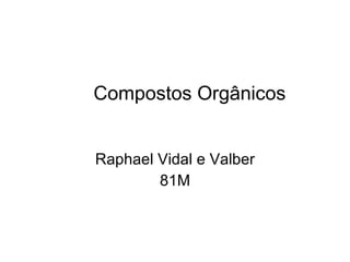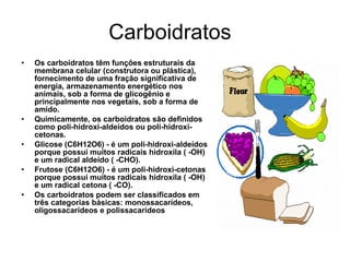 O documento descreve os principais tipos de compostos orgânicos encontrados nos seres vivos, incluindo carboidratos, lipídios, proteínas e ácidos nucleicos. Carboidratos incluem a glicose e frutose e podem ser classificados em monossacarídeos, oligossacarídeos e polissacarídeos. Lipídios fornecem energia e têm função estrutural nas membranas celulares. Proteínas têm funções estruturais, enzimáticas e de defesa no organ