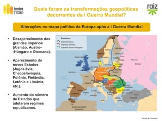 O documento discute as transformações políticas e econômicas na Europa após a Primeira Guerra Mundial, incluindo o desaparecimento de grandes impérios, a assinatura do Tratado de Versalhes e suas condições impostas à Alemanha, e as dificuldades econômicas e sociais enfrentadas na época, como inflação e greves.
