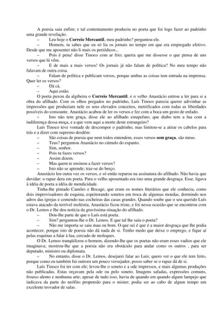 Este documento apresenta um resumo do conto "Aurora sem Dia", de Machado de Assis. Conta a história de Luís Tinoco, um jovem funcionário público que descobre sua vocação para a poesia. Apesar dos conselhos do Dr. Lemos para estudar mais antes de publicar, Luís Tinoco insiste em publicar seus versos de forma precipitada nos jornais. Após cinco meses publicando poesias, Luís Tinoco decide reunir seus versos em um livro.