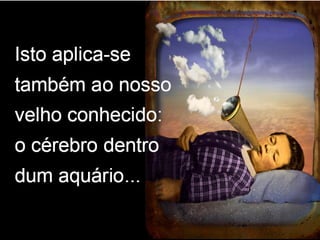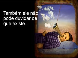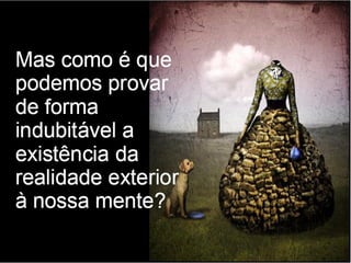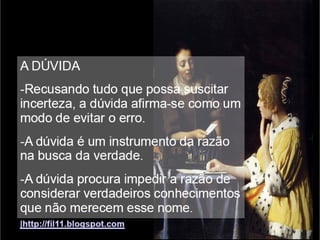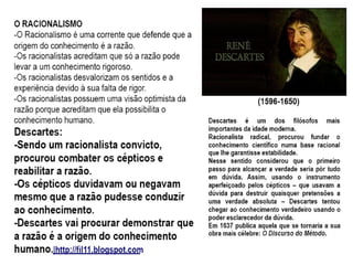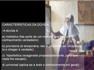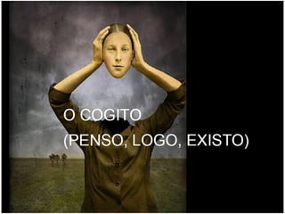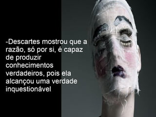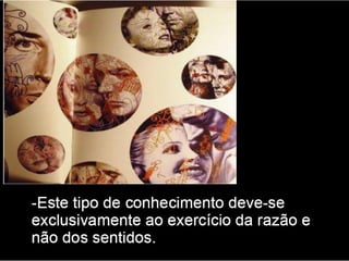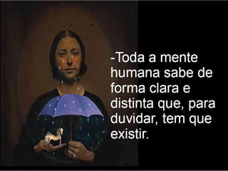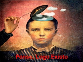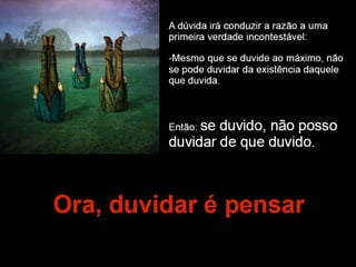 O documento apresenta os principais pontos do racionalismo de Descartes. Ele começa com a famosa frase "Eu penso, logo existo", que serve como evidência clara e distinta, modelo para todo o conhecimento racional. Em seguida, explica que Descartes parte das ideias inatas na mente para provar a existência de Deus, especialmente a ideia de perfeição, que usa como ponto de partida para suas provas.