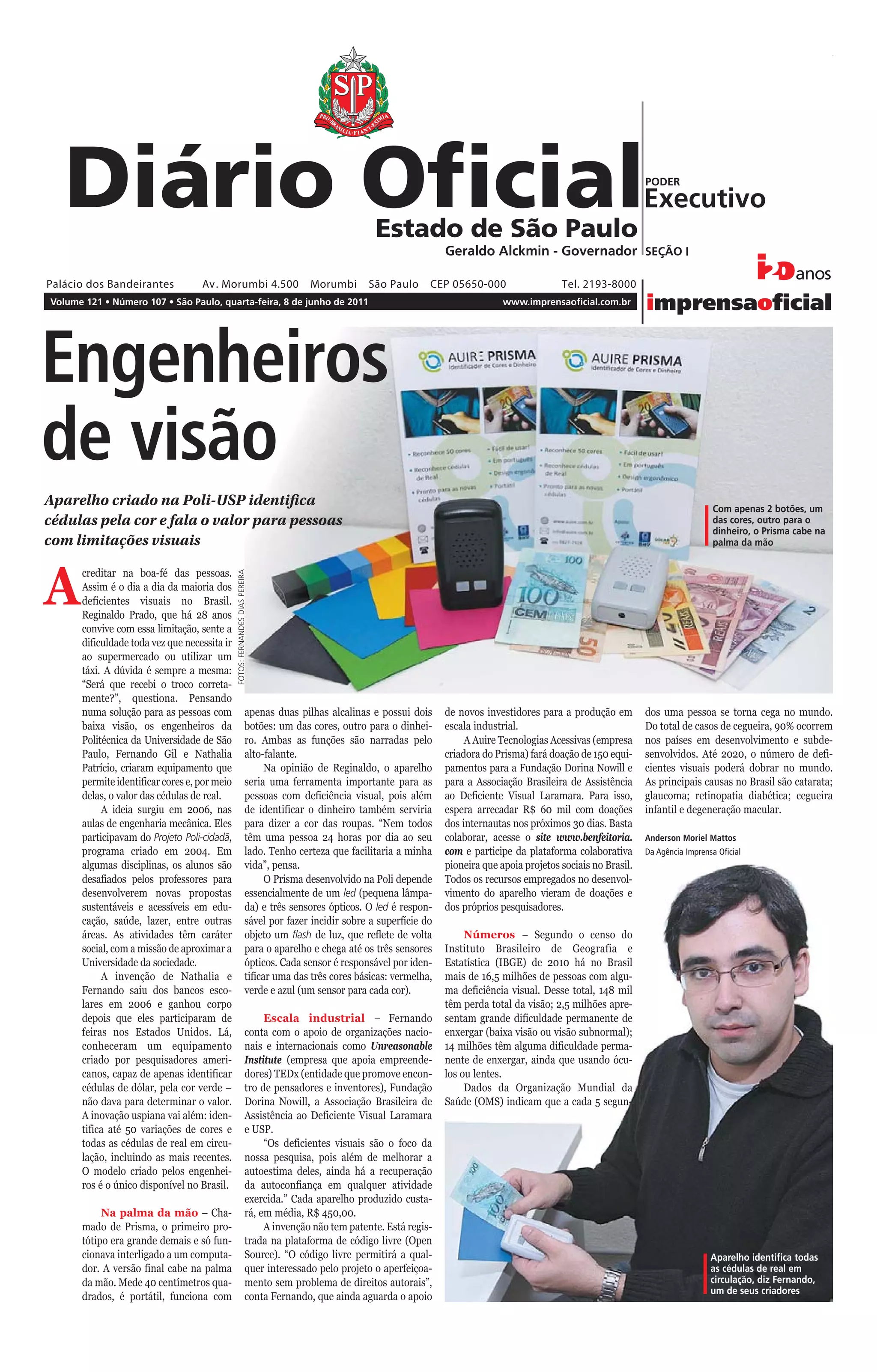 O documento descreve o Prisma, um aparelho desenvolvido por estudantes da Poli-USP para ajudar pessoas com deficiência visual. O Prisma identifica as cores de cédulas e fala o valor em voz alta, permitindo que cegos e pessoas com baixa visão manuseiem dinheiro de forma independente. Atualmente os pesquisadores buscam apoio para produzir o Prisma em escala industrial e doá-lo para instituições que auxiliam deficientes visuais.