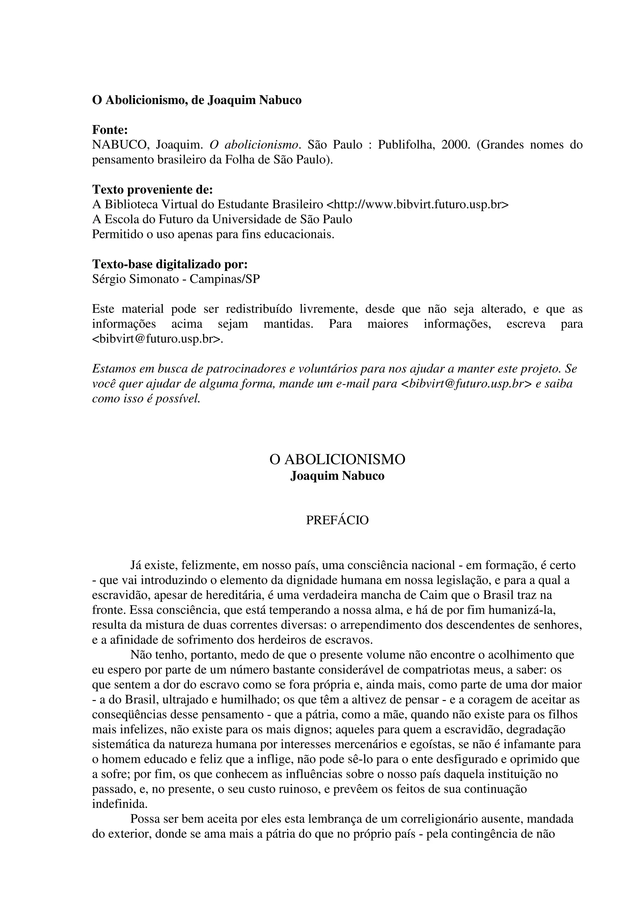 O documento apresenta um resumo do livro "O Abolicionismo", de Joaquim Nabuco. Ele descreve como o abolicionismo no Brasil evoluiu de uma oposição ao tráfico de escravos para uma oposição direta à escravidão e à emancipação dos escravos. O abolicionismo tem como objetivo não apenas libertar os escravos atuais, mas também erradicar os efeitos da escravidão na sociedade brasileira.