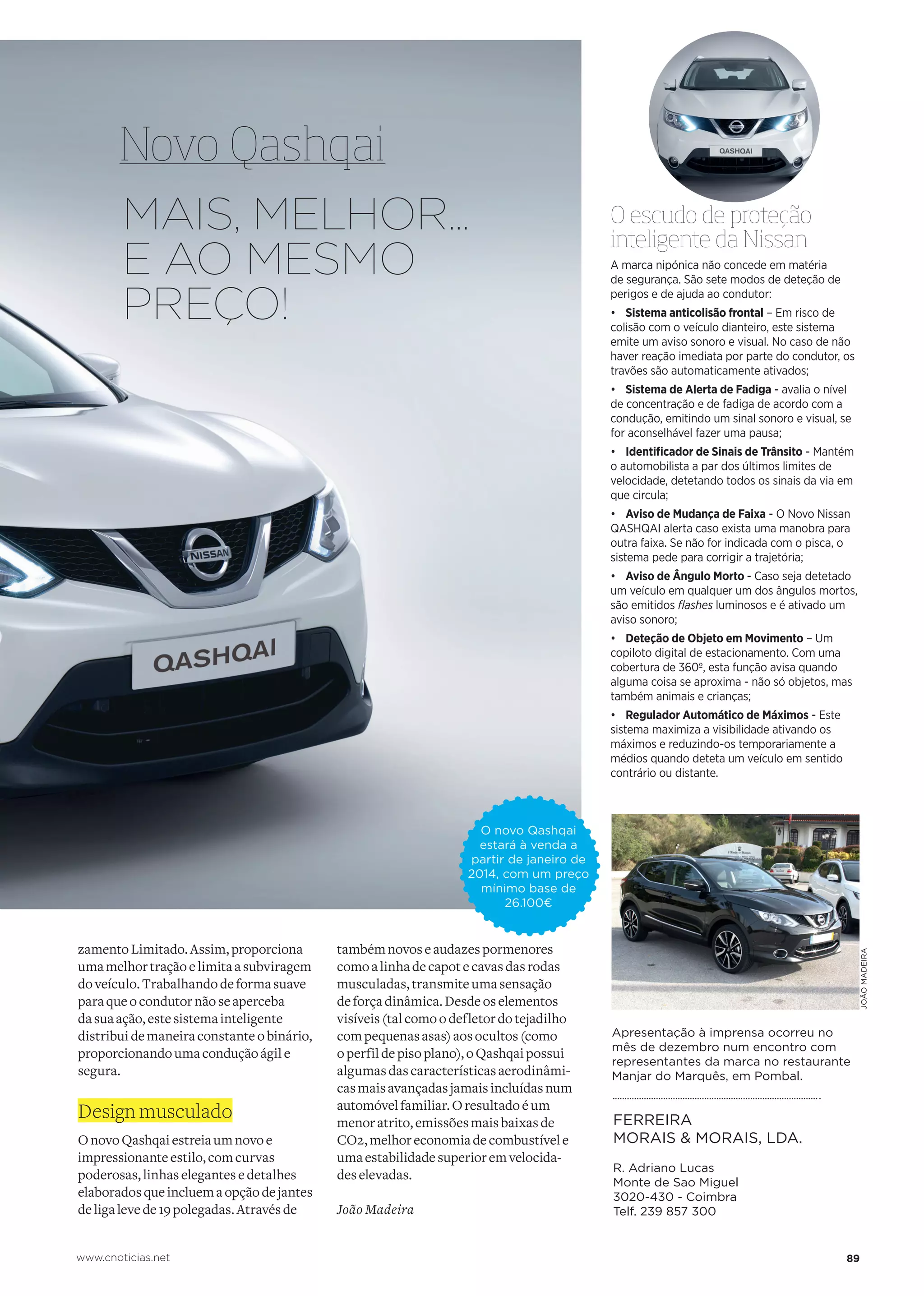 O documento descreve as novas características e sistemas de segurança do Nissan Qashqai 2014, incluindo sete modos de detecção de perigos como colisão frontal, fadiga do motorista, sinais de trânsito e ângulo morto. Ele também destaca o design muscular do veículo com curvas elegantes e detalhes elaborados. O Qashqai 2014 estará à venda a partir de janeiro por pelo menos 26.100€.