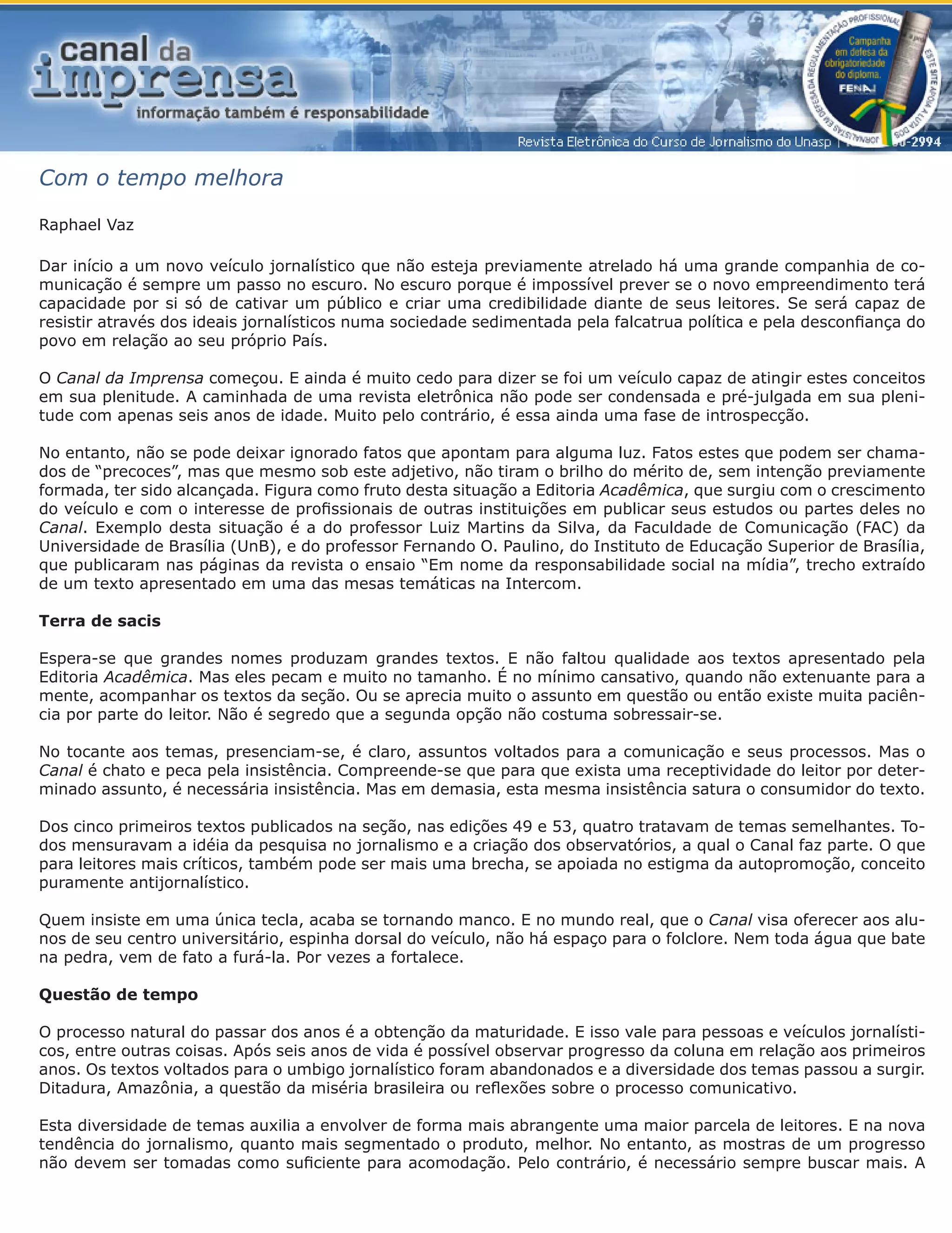O documento discute o progresso do veículo jornalístico Canal da Imprensa após seis anos. Inicialmente, o veículo teve dificuldades em atrair público e estabelecer credibilidade. No entanto, fatos recentes como a criação da Editoria Acadêmica, que publica estudos de professores, mostram algum progresso. Ainda há espaço para melhorias, como diversificar os temas para alcançar mais leitores e evitar excessiva autopromoção.