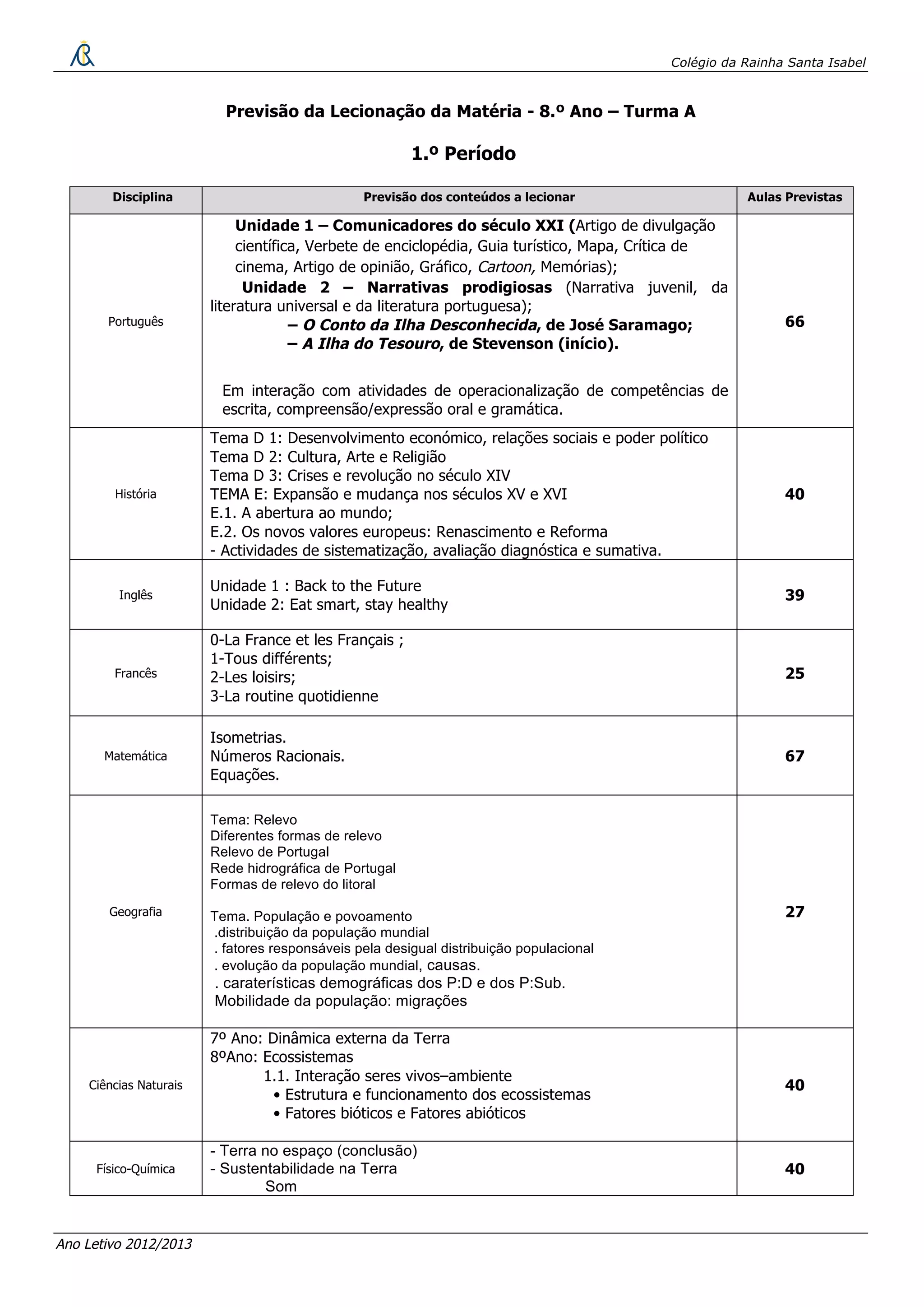 O documento fornece o plano de aulas para o 1o período letivo do 8o ano da turma A do Colégio da Rainha Santa Isabel para o ano letivo de 2012/2013. Ele lista as disciplinas lecionadas, os conteúdos programáticos cobertos e o número de aulas previstas para cada matéria.