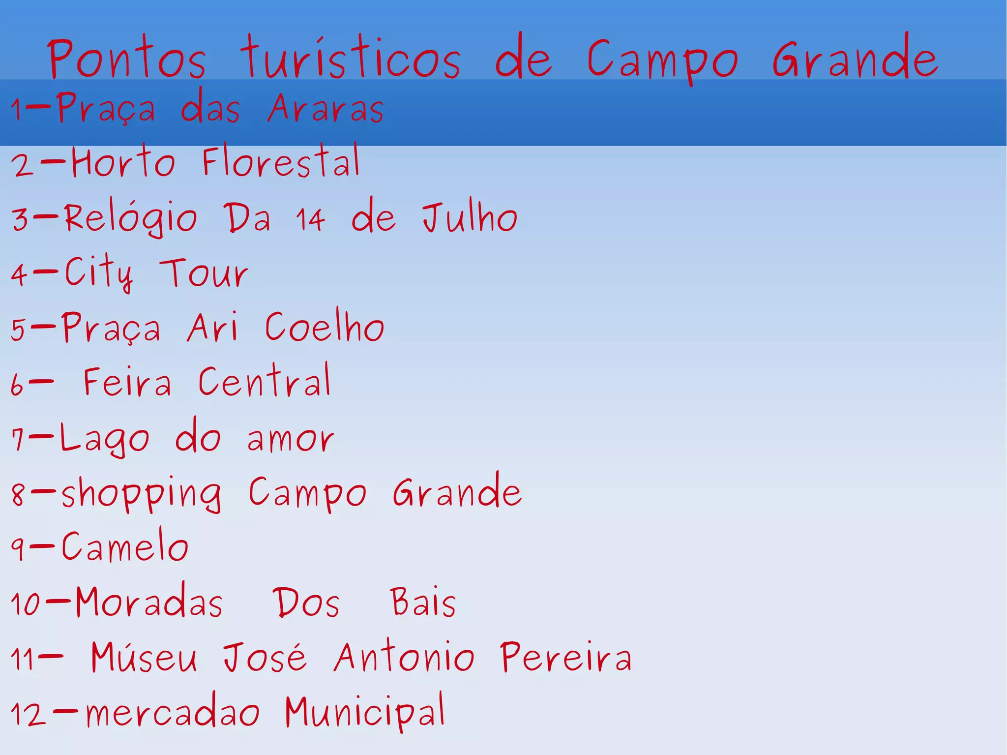 Pontos turísticos deCampo Grande 1-Praça das Araras 2-Horto Florestal 3-Relógio Da 14 de Julho 4-City Tour 5-Praça Ari Coelho 6- Feira Central 7-Lago do amor 8-shopping Campo Grande 9-Camelo 10-Moradas Dos Bais 11- Múseu José Antonio Pereira 12-mercadao Municipal