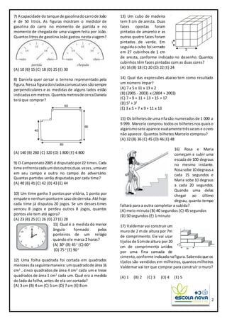 3) As questões abordam tópicos como operações com números, geometria plana, porcentagem, raciocín