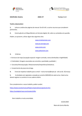 Os alunos devem: 1) Ler e analisar páginas de um manual sobre conteúdos históricos; 2) Construir um mapa mental digital sobre esses conteúdos usando sites recomendados; 3) Enviar o trabalho até 26 de março. A atividade será avaliada com base na estrutura, criatividade, conceitos e cumprimento de prazo.