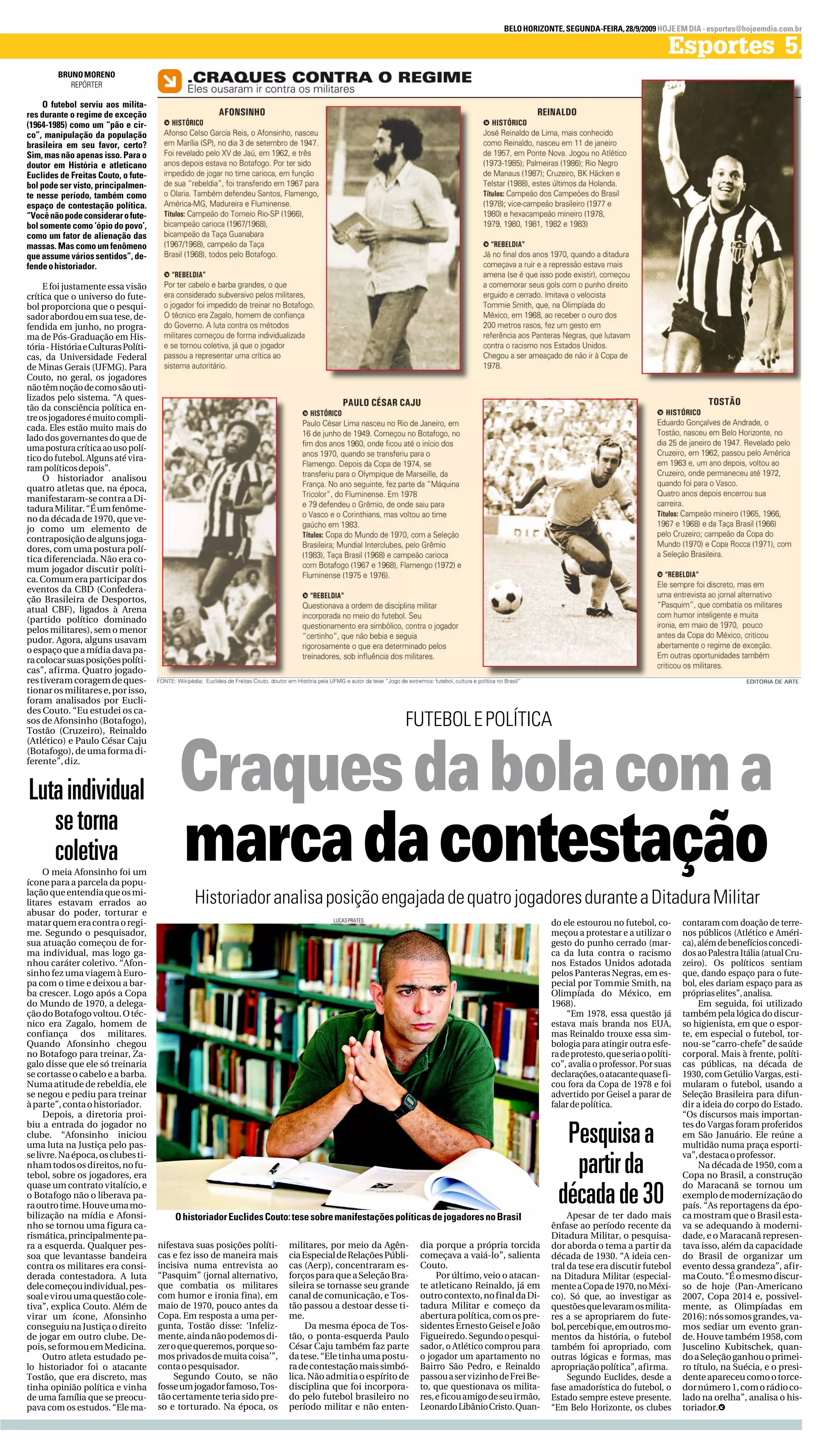 1) O historiador Euclides Couto analisou quatro jogadores que se manifestaram contra a ditadura militar no Brasil: Afonsinho, Tostão, Reinaldo e Paulo César Caju.