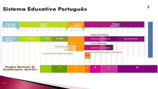 O documento fornece informações sobre as opções disponíveis para estudantes após concluírem o 9o ano, incluindo cursos científico-humanísticos, cursos profissionais e exames nacionais. Resume os principais tipos de cursos, suas disciplinas, duração e objetivos de preparar estudantes para a universidade ou mercado de trabalho.