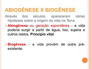 1) O documento discute as principais hipóteses sobre a origem da vida na Terra, incluindo abiogênese, biogênese, panspermia cósmica e evolução química.