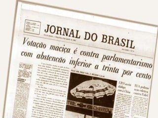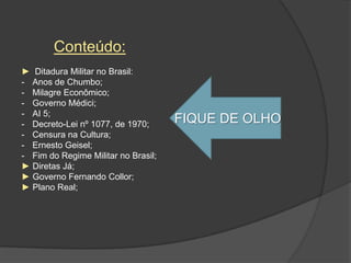 O documento resume a ditadura militar no Brasil, o movimento Diretas Já, o governo de Fernando Collor e o Plano Real. Ele discute a ditadura militar de 1964 a 1985, a transição para a democracia, as manifestações pelo movimento Diretas Já em 1984, o governo de José Sarney de 1985 a 1990 e os vários planos econômicos do período, além do governo de Fernando Collor de 1990 a 1992 e a implementação do Plano Real.