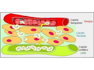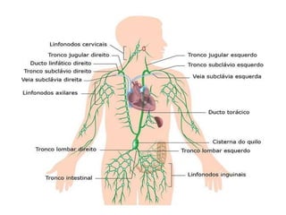 O documento descreve o sistema linfático, incluindo seus componentes (vasos linfáticos, linfonodos e órgãos), funções (drenagem de líquido, transporte de nutrientes, resposta imune) e fluxo da linfa no corpo.