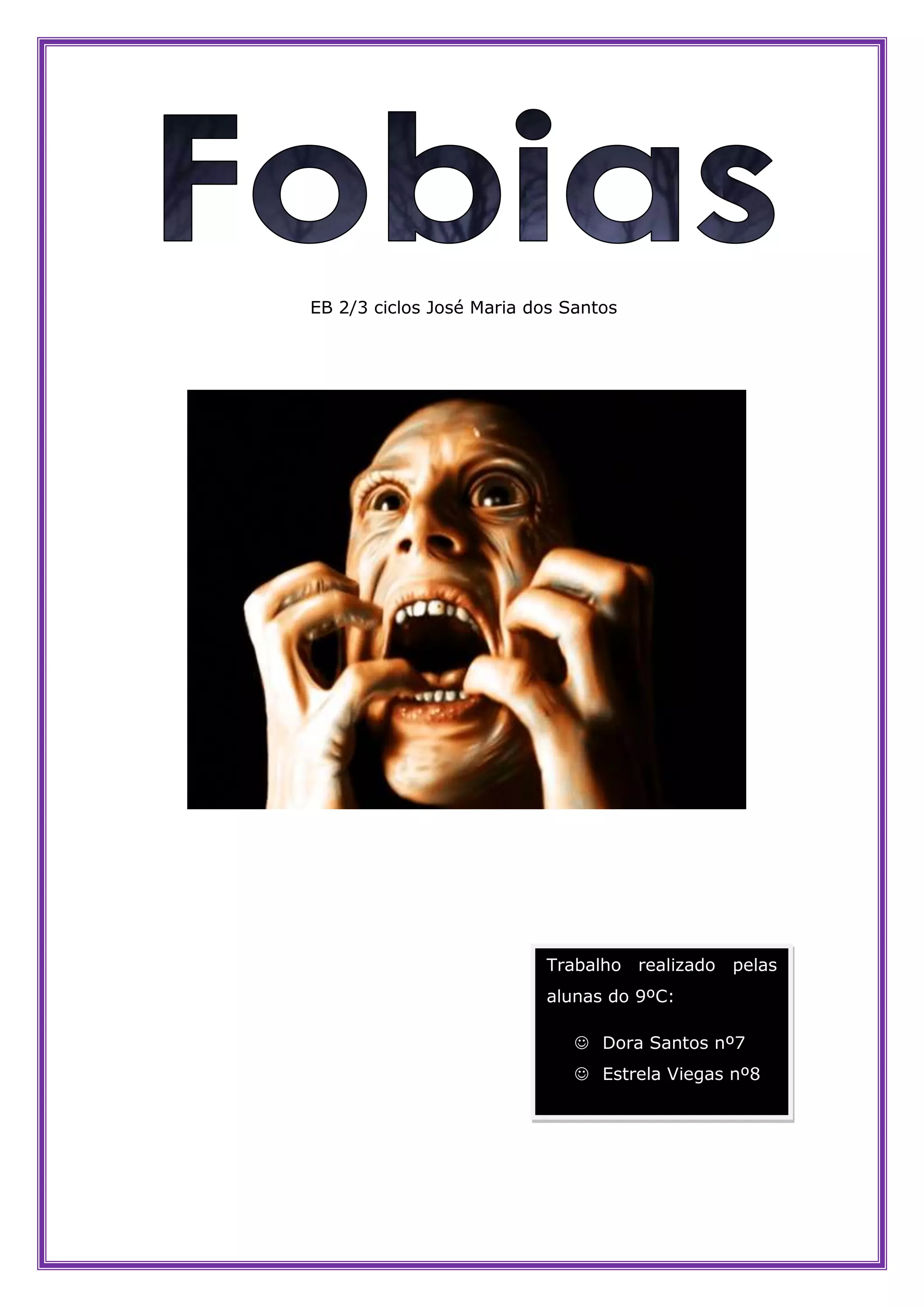 Este documento discute vários tipos de fobias, incluindo fobias comuns como medo de alturas, medo de aranhas, e medo de lugares fechados. Ele também lista fobias mais estranhas como medo de galinhas, medo de tomar banho, e medo de números. O documento explica o que é uma fobia clínica e discute tratamentos como terapia comportamental e cognitiva.