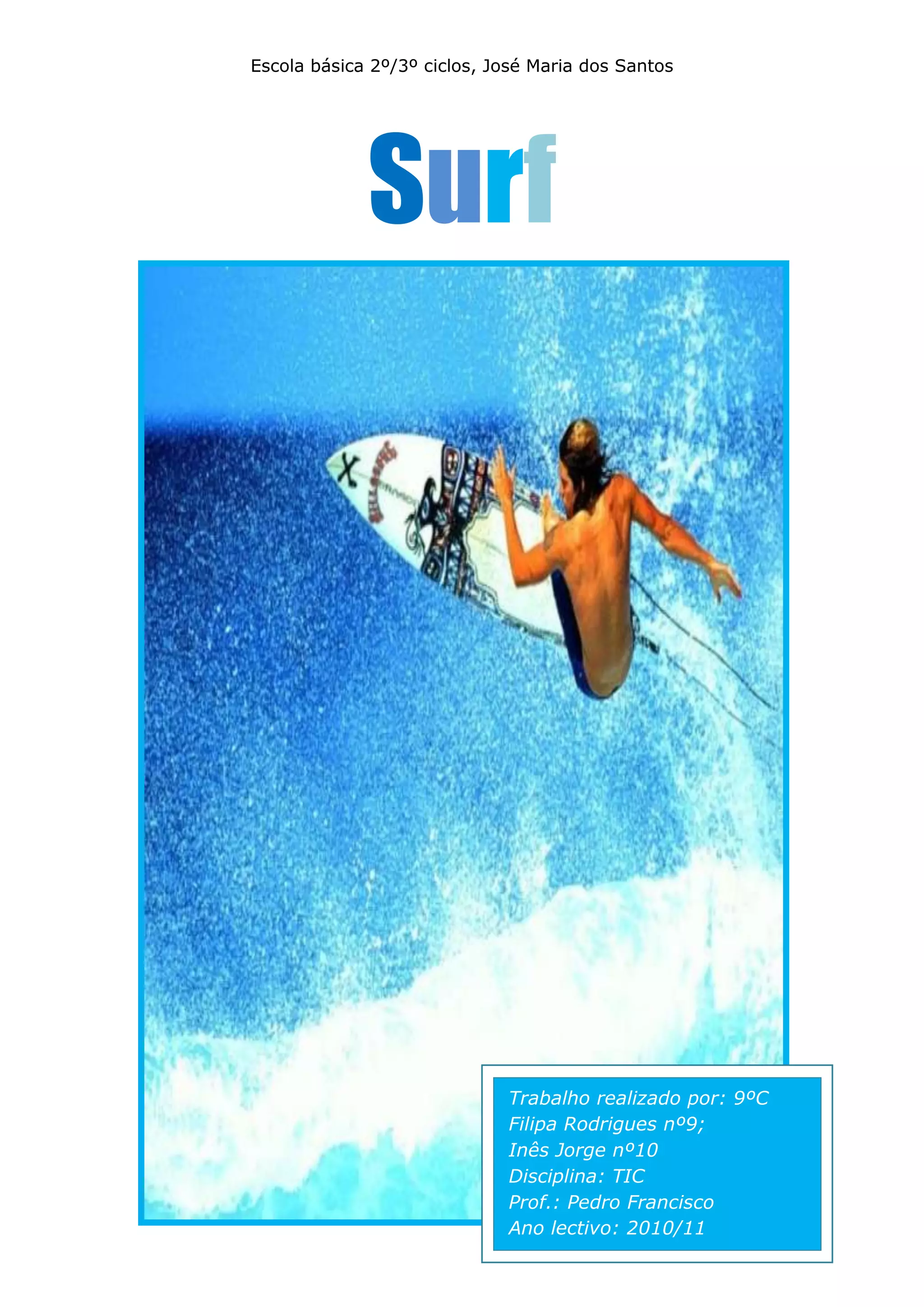 Este documento descreve o esporte do surf, incluindo sua história, reconhecimento, melhores surfistas de todos os tempos e equipamento básico. Aborda a origem do surf entre os povos polinésios, seu reconhecimento mundial com Duke Kahanamoku e popularização na Califórnia na década de 1950. Aponta Kelly Slater e Maya Gabeira como os maiores atletas da história do esporte no masculino e feminino, respectivamente.