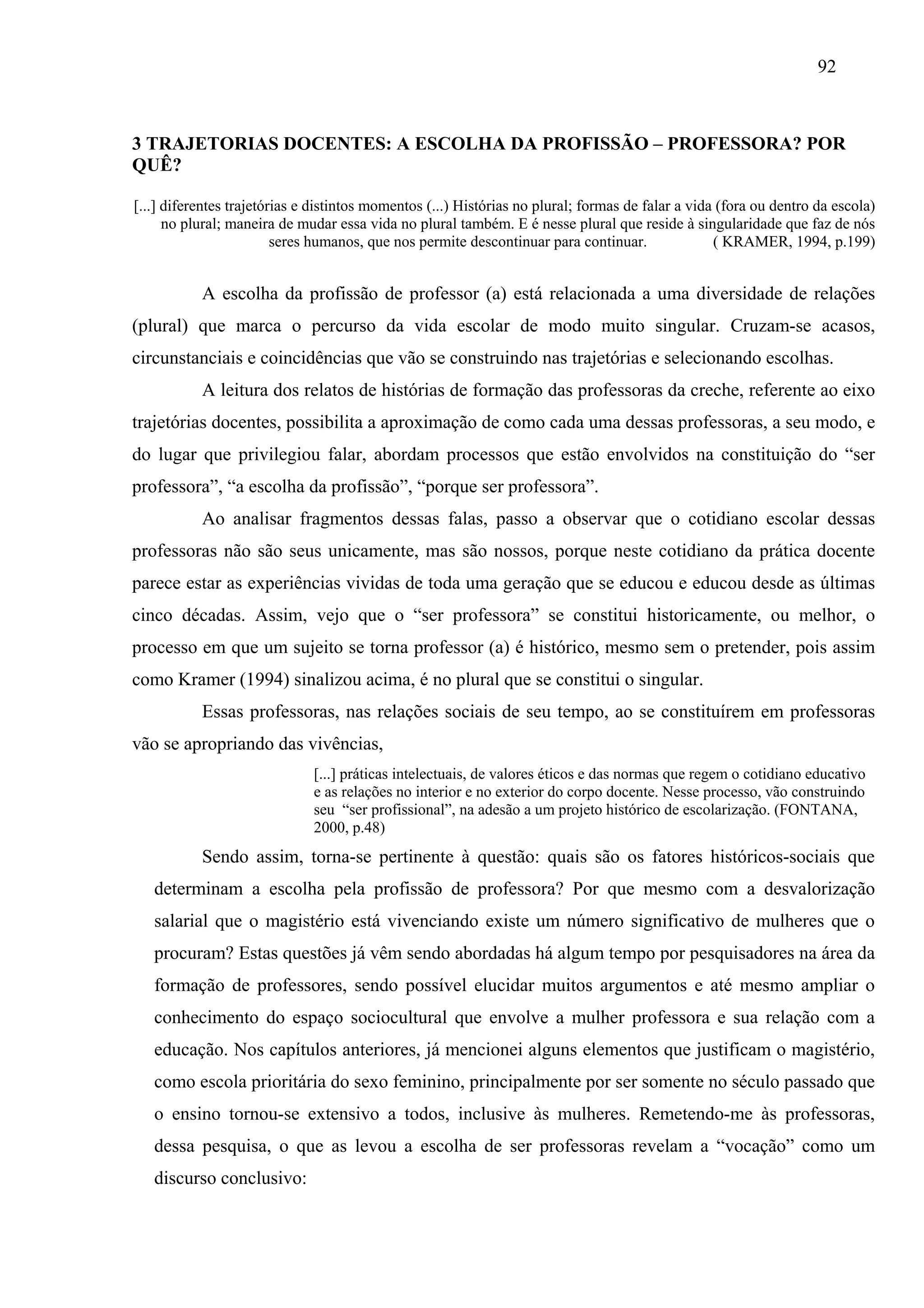 Este documento discute as trajetórias que levam mulheres a escolherem a profissão de professoras, especialmente no ensino infantil. Analisa relatos de professoras e observa que a escolha é influenciada por fatores históricos, sociais e culturais, incluindo a vocação, a influência dos pais e dos papéis de gênero tradicionais. A profissão docente acaba por ser associada a características femininas como paciência e afetividade.