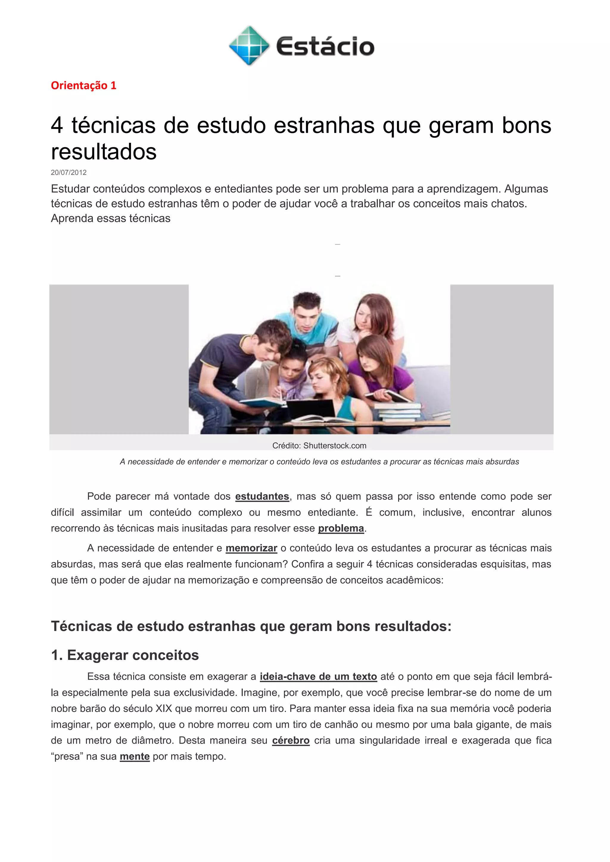 As 4 orientações descrevem técnicas estranhas de estudo que podem melhorar a memorização e compreensão, como exagerar conceitos, associar palavras, criar contextos de estudo e transformar matérias em música. As orientações também fornecem dicas para planejamento dos estudos, como manter um calendário e priorizar tarefas, e ferramentas para organização do tempo, como planejadores e listas diárias.