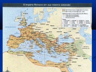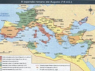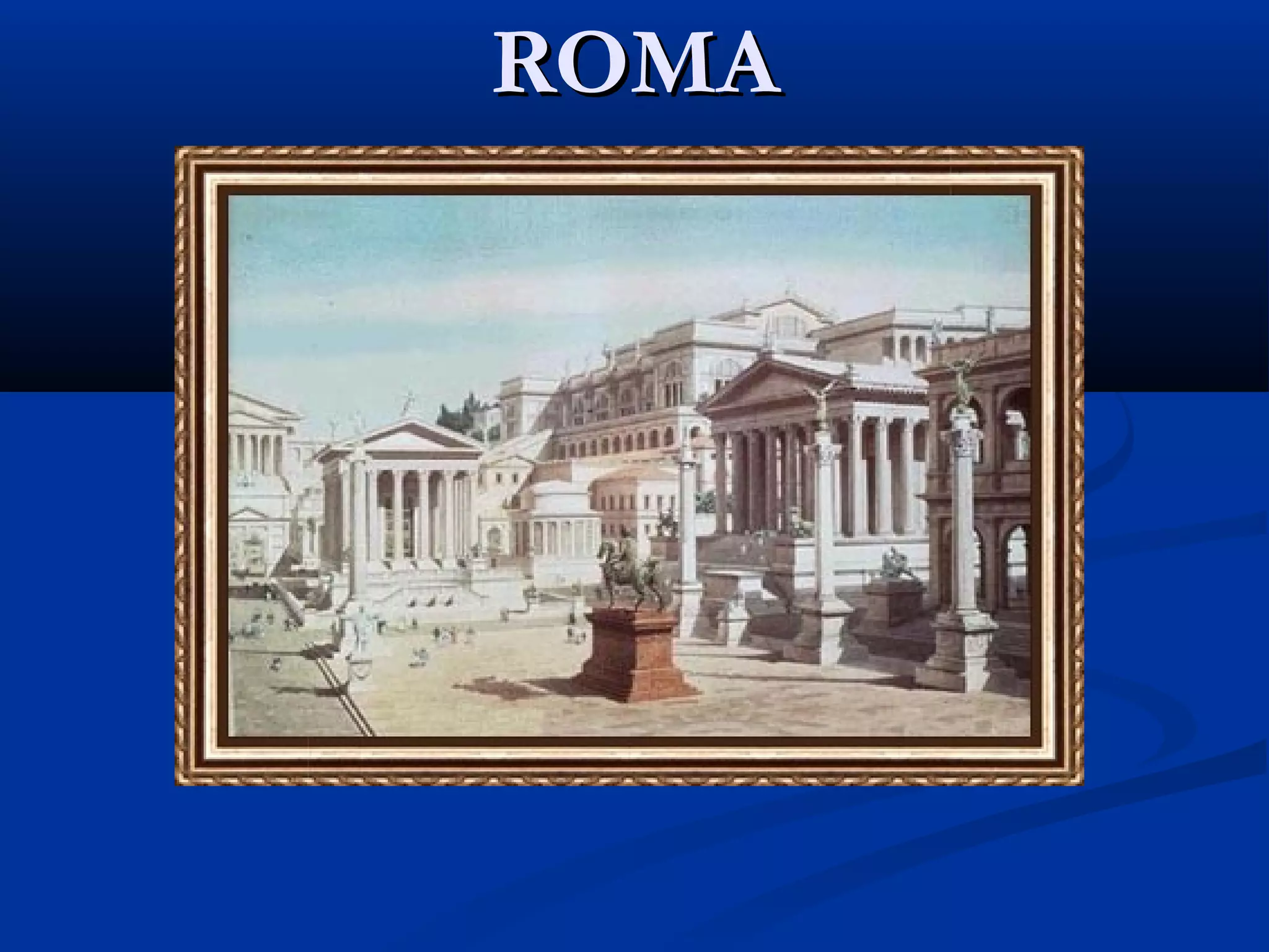 O documento resume a localização e história inicial de Roma, desde sua fundação pelos latinos nas margens do rio Tibre até o período monárquico e os sete primeiros reis. Também descreve a estrutura social e política da república oligárquica inicial e sua democratização gradual através de leis que concederam direitos aos plebeus.